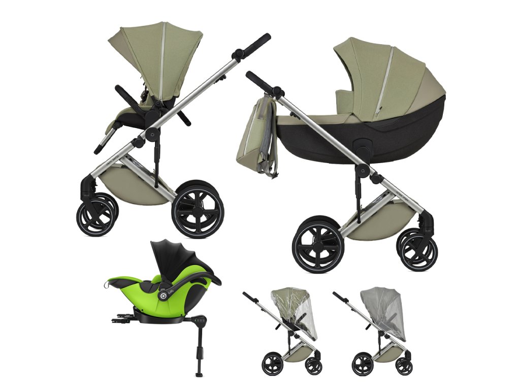 Obsahuje: vaničku, športovú časť, zvyšovacie adaptéry, elegantný batoh, pláštenku, moskytiéru, madlo. Súčasťou kočíka je tiež autosedačka Kiddy Evoluna i-size 2 spolu s isofix základňou.