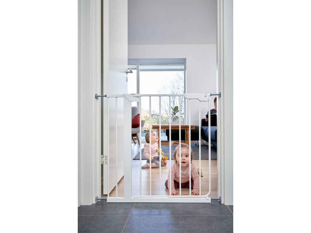 Maja je kovová tlakovo montovaná zábrana s indikátorom do otvoru 74–80 cm od dánskeho výrobcu Baby Dan, špecialistu na bezpečnosť.