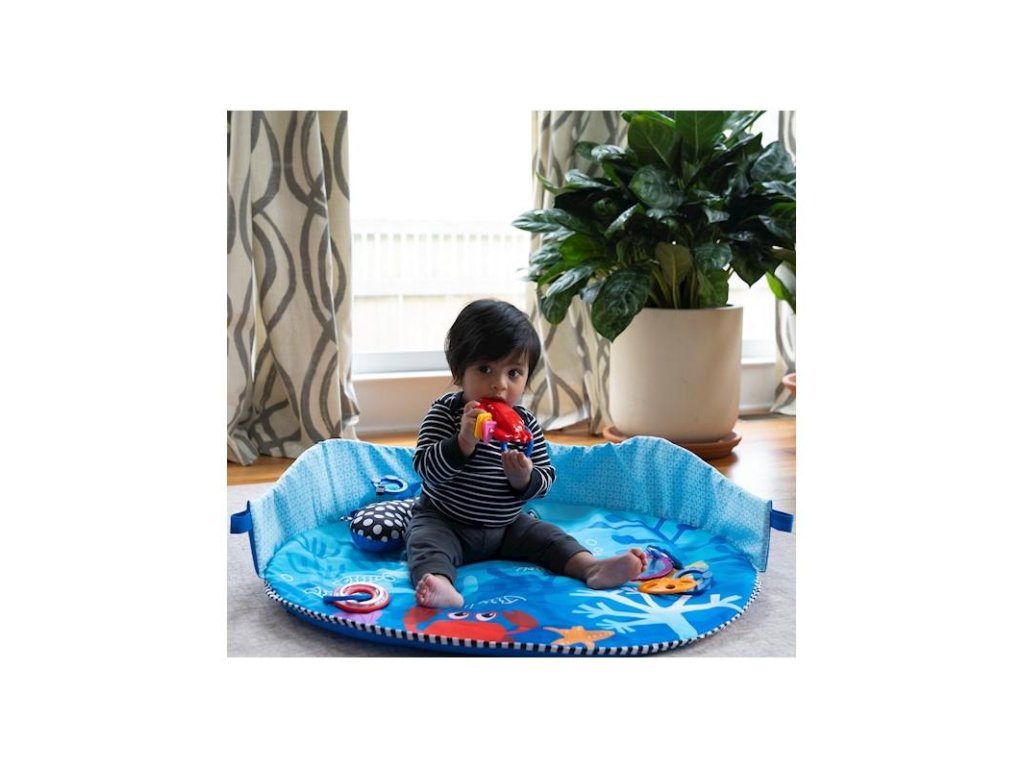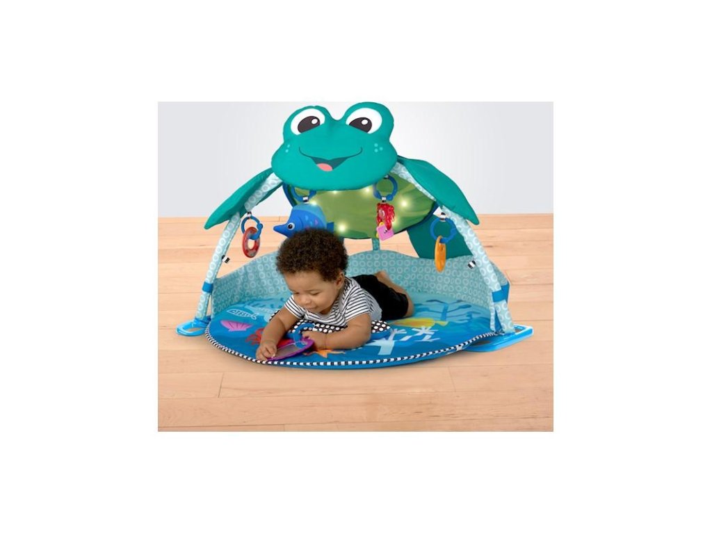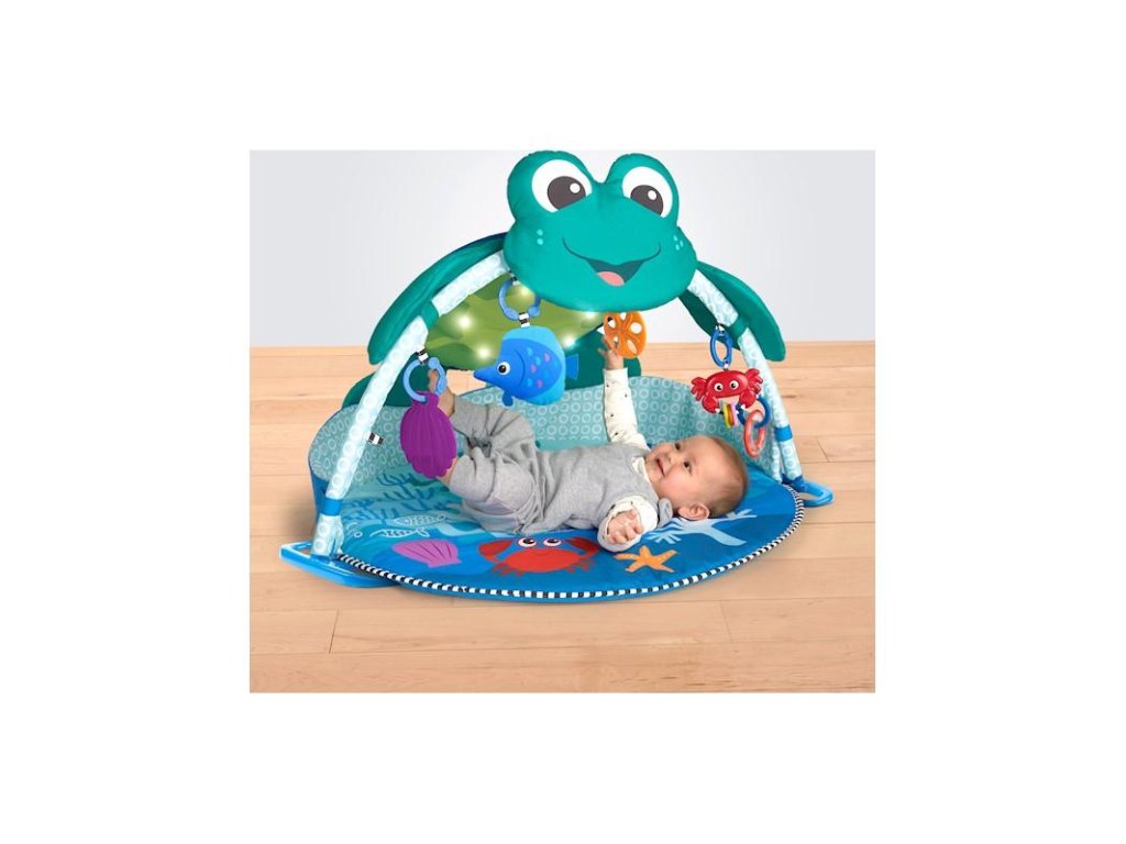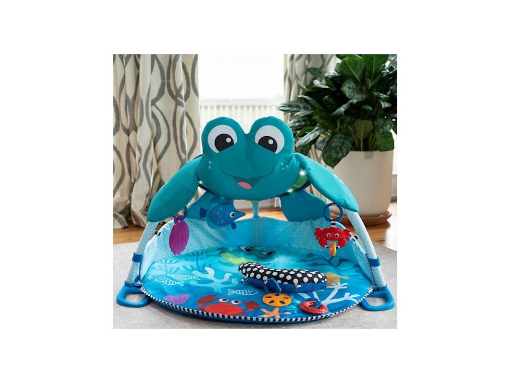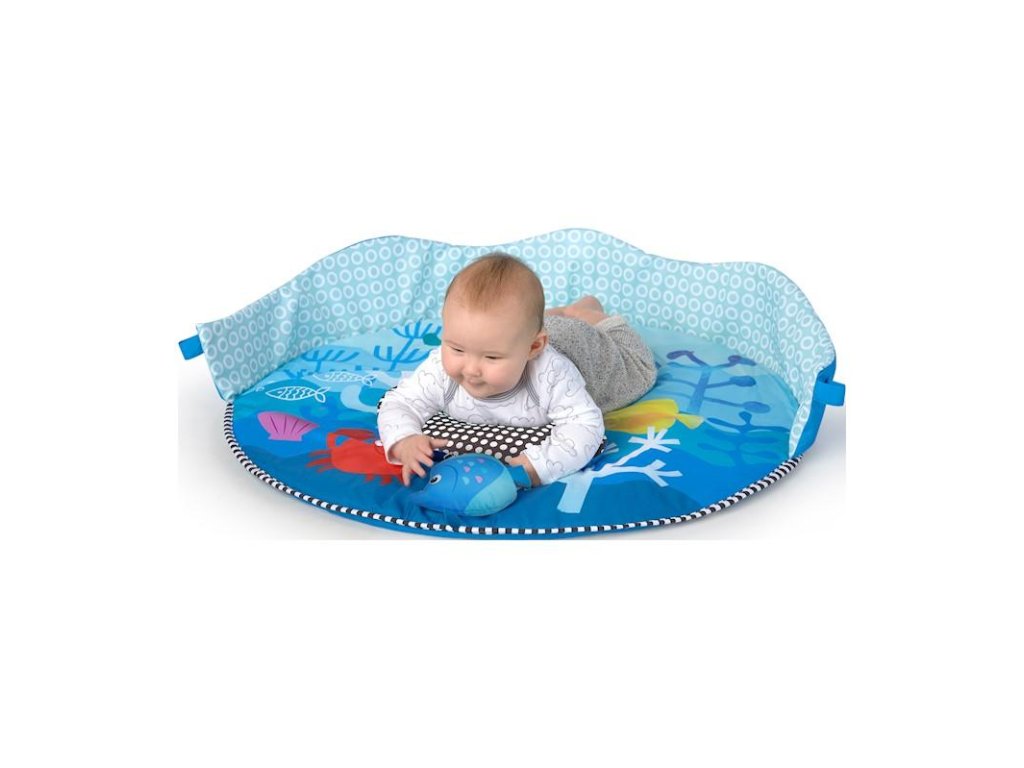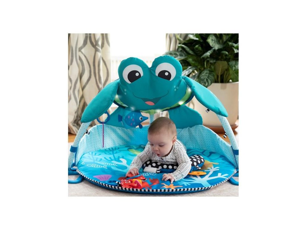 Vďaka tejto detskej deke so svetlami a melódiami čaká vaše dieťa objavovanie a hranie sa ako na morskom dne. Deka poskytuje viac ako 20 minút jemného osvetlenia s melódiami z celého sveta, ktoré dokážu zaujať aj tie najzvedavšie deti či už pri hraní sa na chrbátiku, brušku alebo v sede. Vrch deky vytvára 360 stupňový baldachýn posiaty žiariacimi svetlami a interaktívnymi závesnými hračkami, ktoré stimulujú zrak a rozvoj svalov na krku. Podporný vankúšik umožní vášmu dieťatku precvičiť si svaly na brušku a na textilné pútka vankúša môžete zavesiť rôzne hračky. Táto deka na hranie umožní bábätkám hranie sa v bezpečnom priestore a vy si môžete vychutnať chvíle s voľnými rukami a zároveň sledovať aké nové objavy robí váš drobček v podmorskom svete.