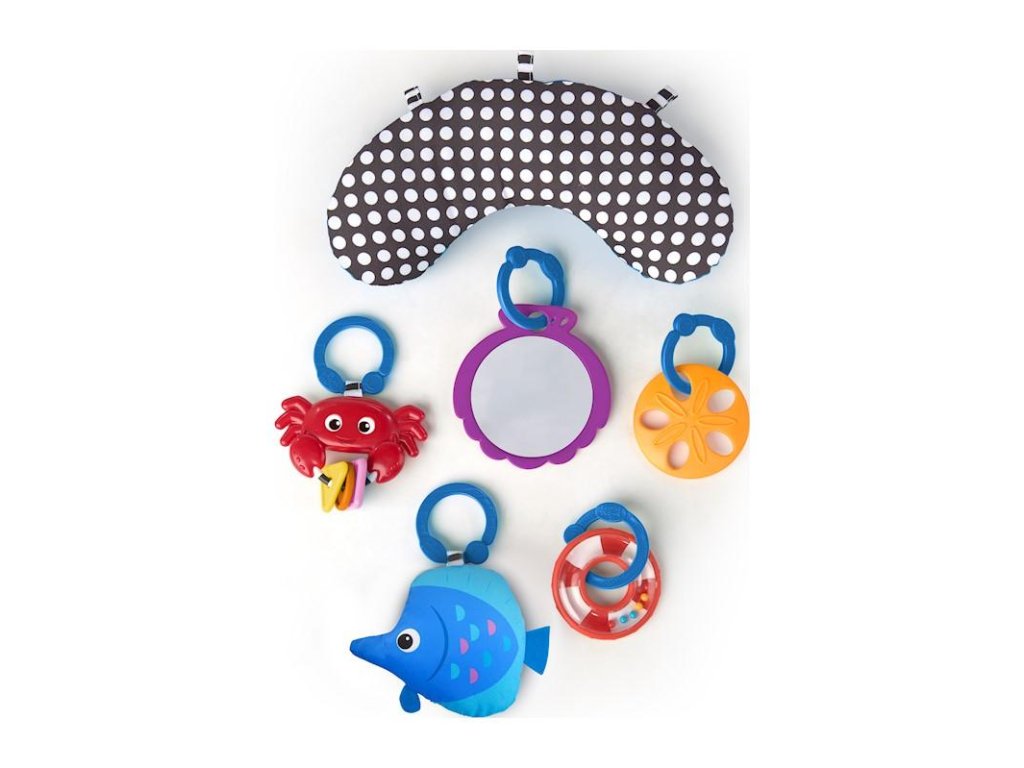 - 5 interaktívnych hračiek, ktoré je možné odopnúť – plyšová rybka, zrkadielko, hrkálka, hryzačka, krab s korálkami.
