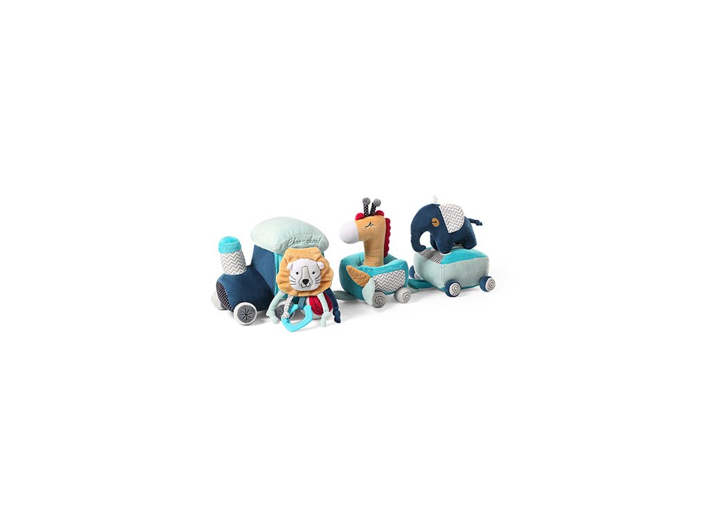 Vláčiková súprava vzdelávacích hračiek Safari train sa skladá z lokomotívy s dvoma vagónmi a pripojenými plyšovými hračkami: pískajúcimi, hrkajúcimi a šuštiacimi. Hračka zoznamuje dieťa s rozmanitým svetom farieb, zvukov a tvarov. Vďaka prichyteniu na suchý zips a dômyselne navrhnutým priestorom pre hračky možno vytvárať zaujímavé kombinácie, ktoré podnecujú kreatívne myslenie.