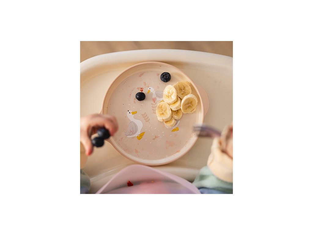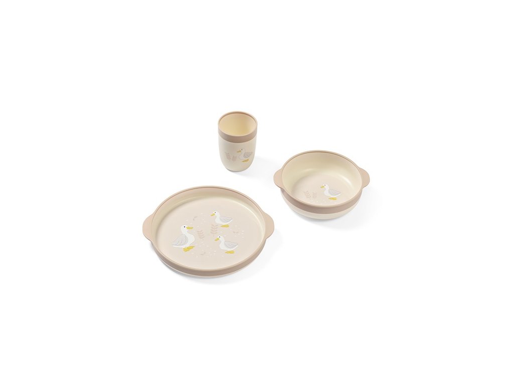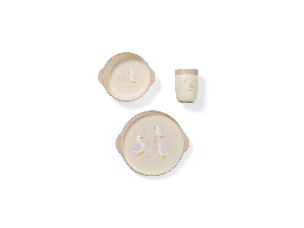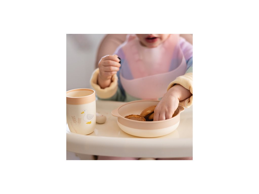 - tanier, miska aj pohár majú protišmykovú úpravu dna, takže počas jedenia sa nešmýkajú po stole, čím sa znižuje neporiadok a zvyšuje komfort dieťaťa
