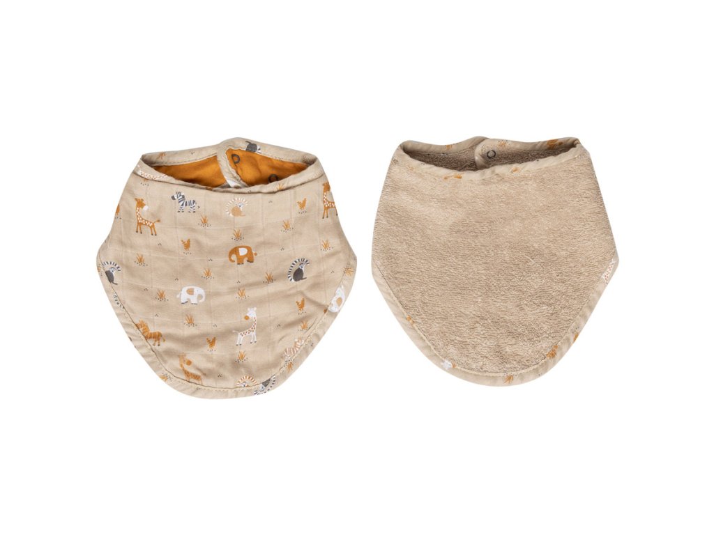Tento béžový módny slintáčik-bandana z bavlneného froté, môže vaše dieťa nosiť po celý deň. Super užitočné, keď potrebujete ochrániť oblečenie pri kŕmení alebo ak dieťa pri raste zubov viac sliní. Slintáčik má certifikáciu Öko-Tex a môže byť veľmi originálnym darčekom k narodeniu bábätka.