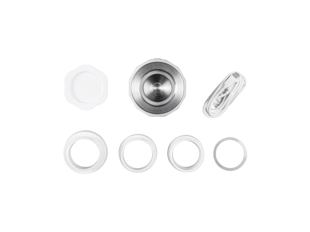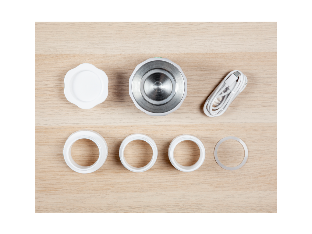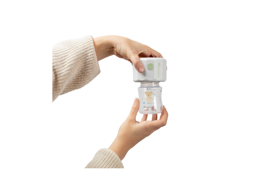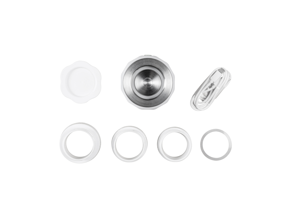 Súčasťou balenia je ochranné veko, USB-C nabíjací kábel, náhradné silikónové tesnenie, 50mm adaptér na fľašu (NUK), 60mm adaptér na fľašu (Tommee Tippee), 53mm adaptér na fľašu (MAM).