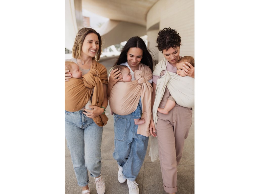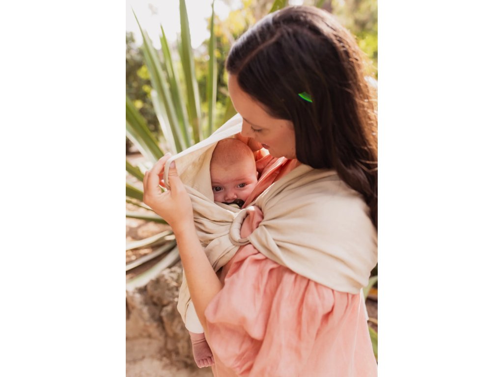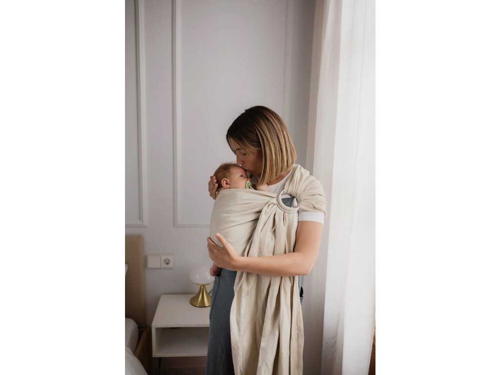 - Bezproblémovo sa prispôsobí od novorodenca po batoľa jednoduchým potiahnutím látky cez krúžky.