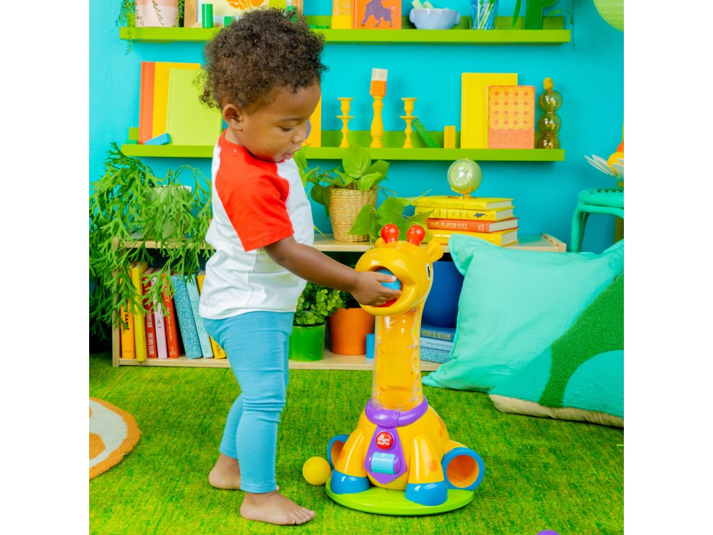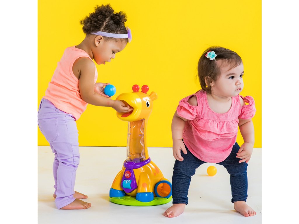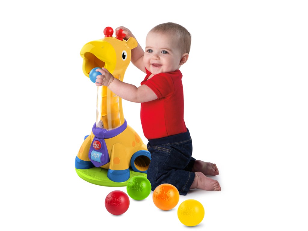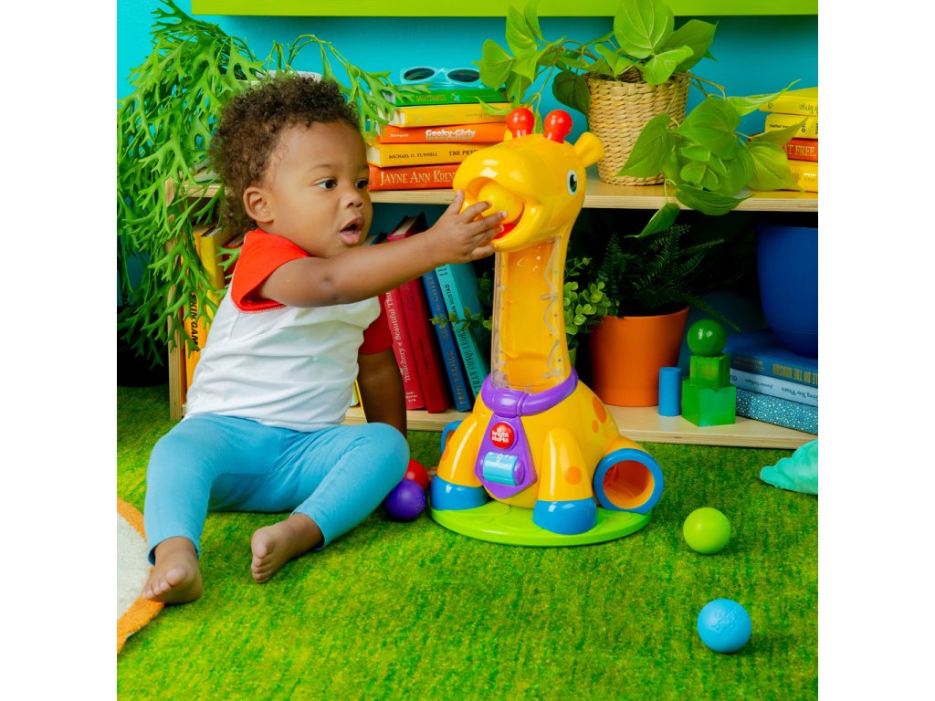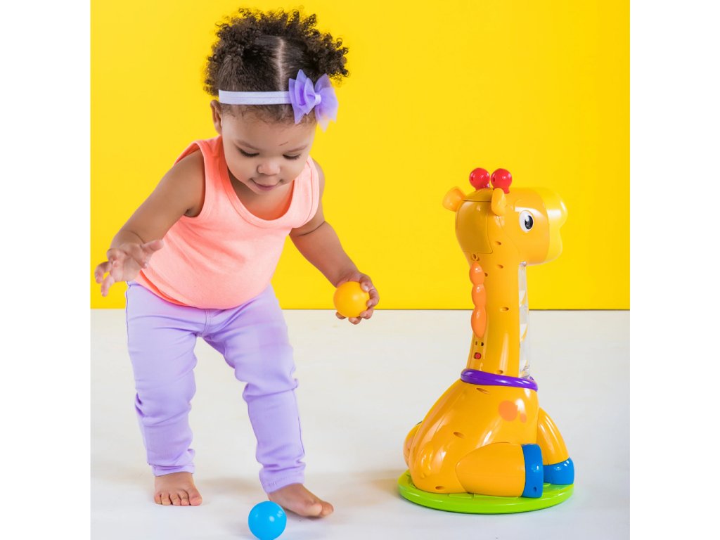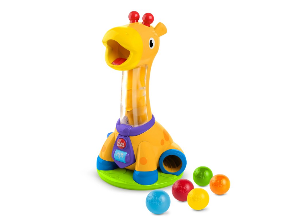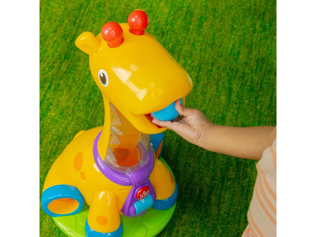 - Vložte loptičky do úst žirafy Bright Starts Spin & Giggle Giraffe; Bábätko si môže precvičovať jemnú motoriku, zatiaľ čo žirafu „kŕmi“ loptičkami, čo tiež aktivuje hudbu a svetlá.