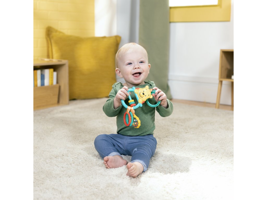 Nechajte svoje malé zvedavé „včielky“ bzučať od radosti s touto roztomilou hračkou s motívom medvedíka Pú! Táto všestranná a zmyslovo podnetná hračka poskytuje až 3 spôsoby hry, ktoré podporujú vývin jemnej motoriky a zmyslové vnímanie. Ideálny spoločník na doma aj na cesty vďaka praktickému C-krúžku na uchytenie ku kočíku či autosedačke. Hračka je vyrobená z bezpečných materiálov, certifikovaných pre najmenšie deti. Jemné farby sú inšpirované Stoakrovým lesom, ktorý predstavuje bezpečné, detské a čarovné prostredie, kde sa dejú všetky dobrodružstvá. Pre deti je to symbol priateľstva, fantázie a hravosti a žijú v ňom všetky zvieratká z rozprávky Medvedík Pú.