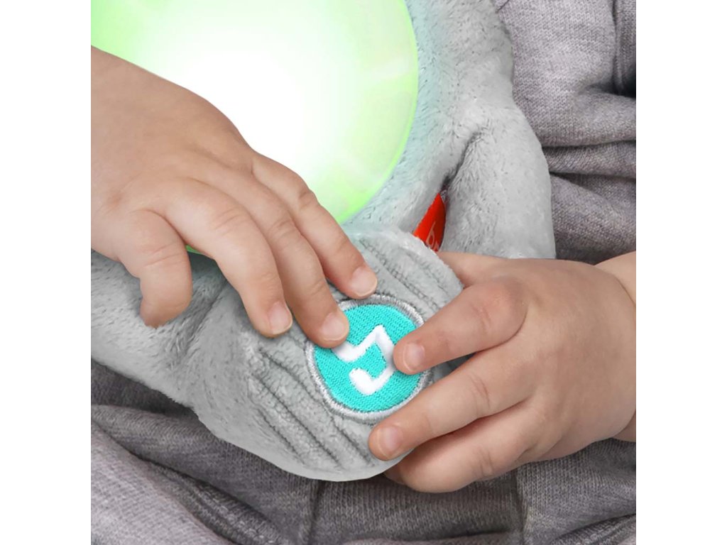 Tento mäkký plyšový sloník sa stane tým najlepším kamarátom vášho dieťatka. Mäkké plyšové zvieratko hrá viac ako 20 minút upokojujúce melódie a rozsvieti sa po jemnom stlačení nožičky. Prepínajte medzi dvoma režimami prehrávania buď nepretržitej hudby, alebo krátkych pesničiek. Sledujte, ako sa sloníkovo bruško mihá v rytme melódií! Vaše dieťa si zamiluje upokojujúcu žiaru bruška svojho nového kamaráta. Preskúmajte množstvo textúr, hrkálok a stužiek, ktoré podporujú rozvoj jemnej motoriky.