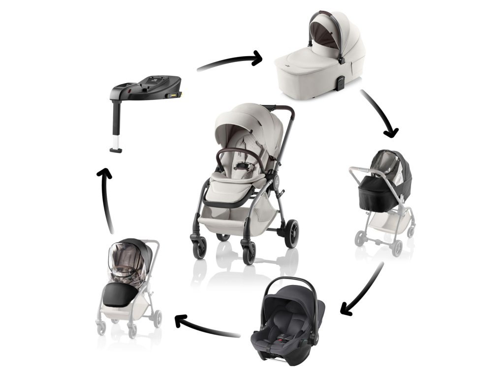 Športový kočík Britax Römer Rio, hlbokú vaničku Britax Römer Rio, autosedačku Baby-Safe Core, základňu Baby-Safe Core Base, pláštenku na kočík Rio a pláštenku na hlbokú vaničku Rio.