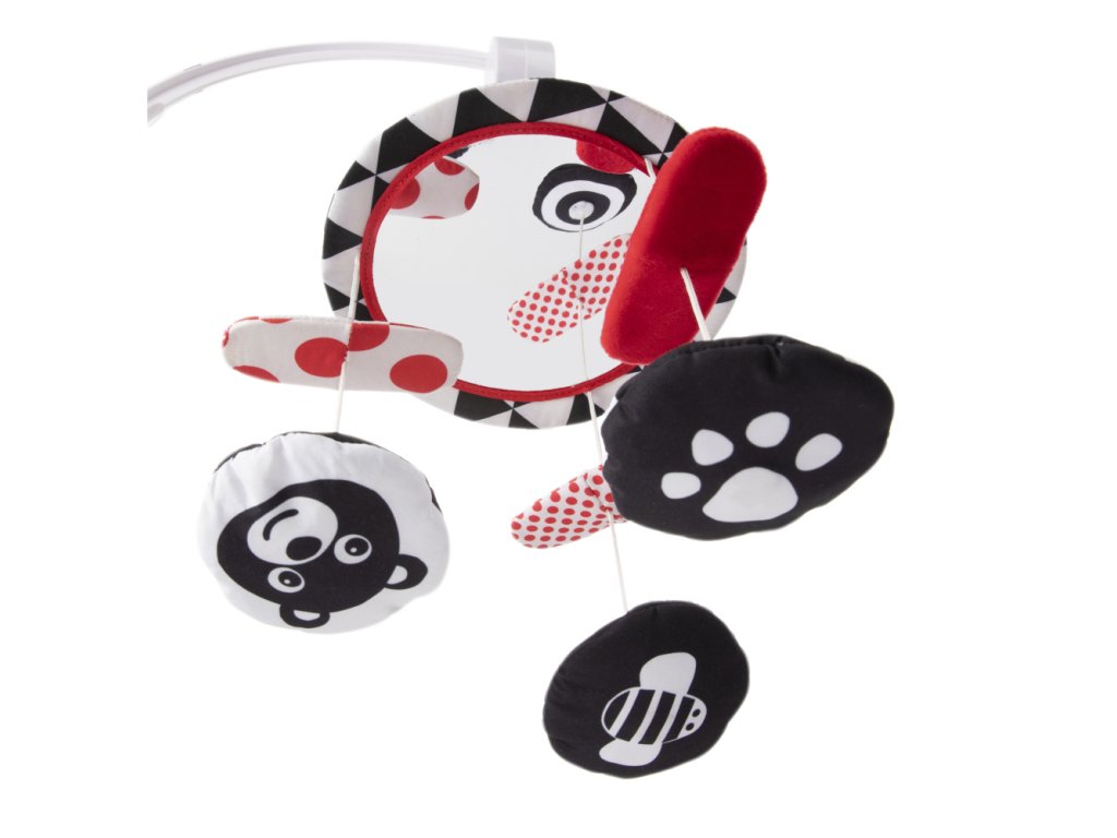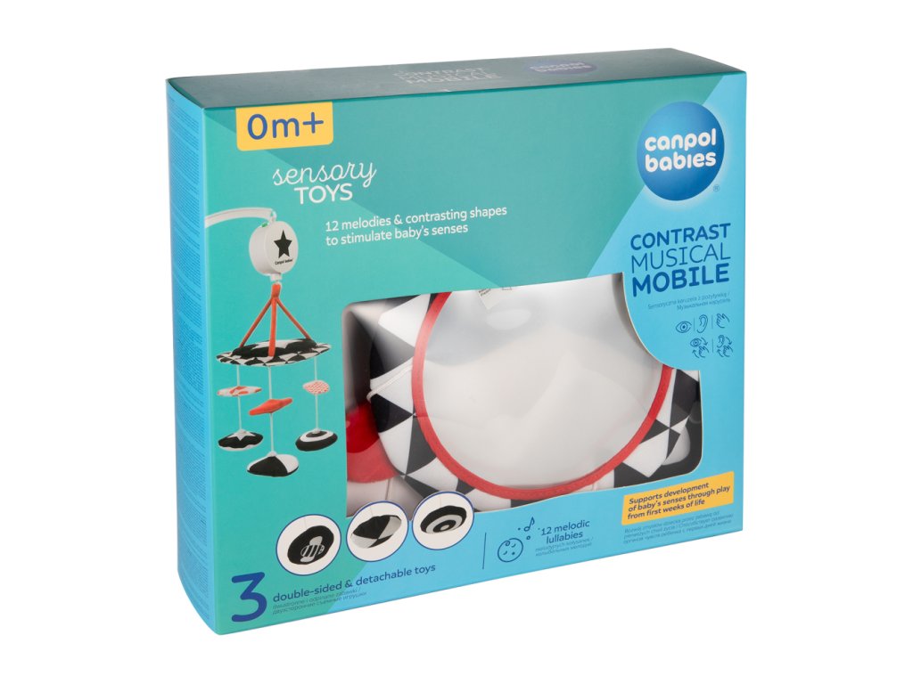 Kontrastný hudobný kolotoč s hracou skrinkou z kolekcie SENSORY TOYS má interaktívne prvky, s ktorými sa dieťa zabaví na dlhý čas. Podporuje rozvoj batoľaťa od prvých dní. Stimuluje zrak vďaka červenej a čiernej farbe – prvým farbám, ktoré novorodenci vidia. Hračka pozitívne ovplyvňuje rozvoj zrakovej, sluchovej a motorickej koordinácie dieťaťa. Má 12 rôznych príjemných melódií pre dieťa. Veľké zrkadlo je ďalším lákadlom – každé dieťa sa rado pozerá okolo seba a pozoruje svet. Obojstranné magnetické prvky sú navrhnuté tak, aby rástli spolu s dieťaťom. Umožňujú otočiť obojstranné hračky a prispôsobiť ich vývoju vášho dieťaťa. Počas prvých mesiacov života sú tieto prvky skvelé vďaka svojim kontrastom a veľkým geometrickým vzorom, ktoré vaše dieťa vidí v počiatočnom štádiu vývoja. Keď dieťa dosiahne 6. mesiac veku, zložitejšie tvary, ako napríklad medvedík, včela alebo labka určite upútajú jeho pozornosť a povzbudia ho k hraniu. Každá hračka obsahuje inú atrakciu pre dieťa: šuštivé prvky, pískadlá, hrkálku. Hračky sa dajú oddeliť a dať dieťaťu na hranie. Sú mäkké a príjemné na dotyk. Určené pre deti hneď od narodenia.