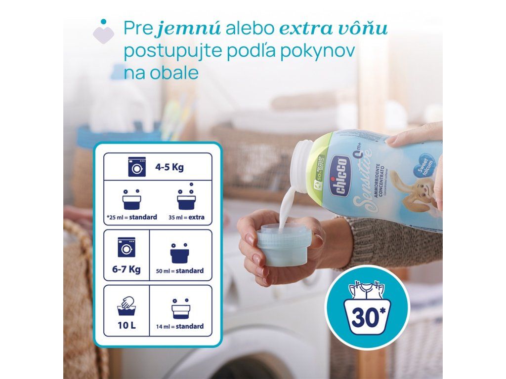 Chicco aviváž osviežuje a zjemňuje všetky detské vecičky bábätka bez podráždenia jeho citlivej pokožky.