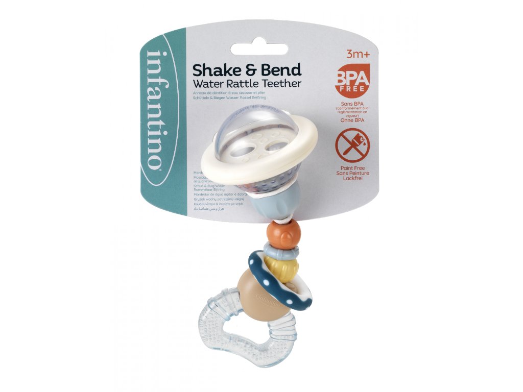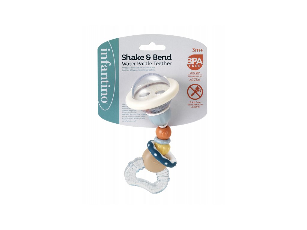 Hrkálka s hryzátkom Infantino zaujme vaše bábätko hrkajúcimi farebnými korálkami v priehľadnej guličke aj ohybnou konštrukciou s posuvnými korálkami. Hryzátko naplnené vodou je možné ochladiť v chladničke pre väčšiu úľavu pri prerezávaní prvých zúbkov.