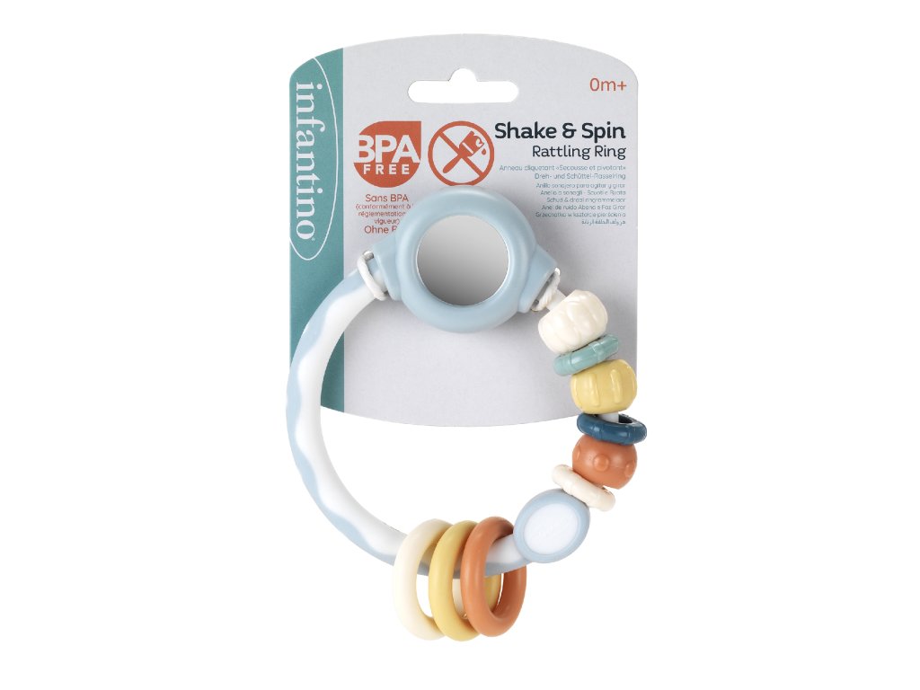 Ľahká hrkálka Infantino zabaví vaše bábätko doma aj na cestách. Farebné krúžky sa posúvajú a otáčajú, rôzne textúry nabáda k preskúmavaniu prstíkov aj v ústach. Nechýba ani bezpečné zrkadlo, ktoré pritiahne pozornosť bábätka. Hračka má tvar pre ľahké uchopenie malými detskými ručičkami.