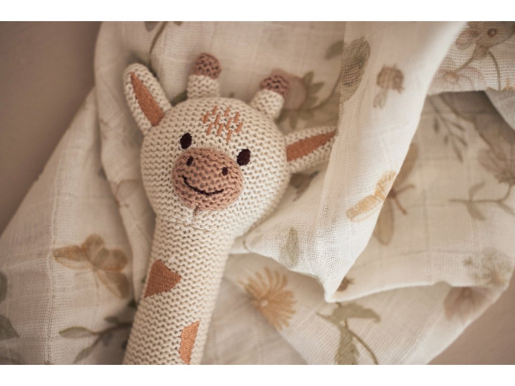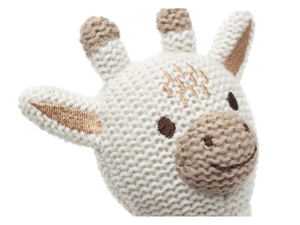 Hrkálka v podobe žirafy z mäkkého bavlneného materiálu má tvar pre ľahké uchopenie a pri pohybe jemne hrká.