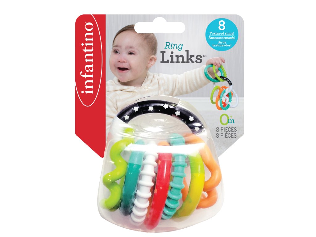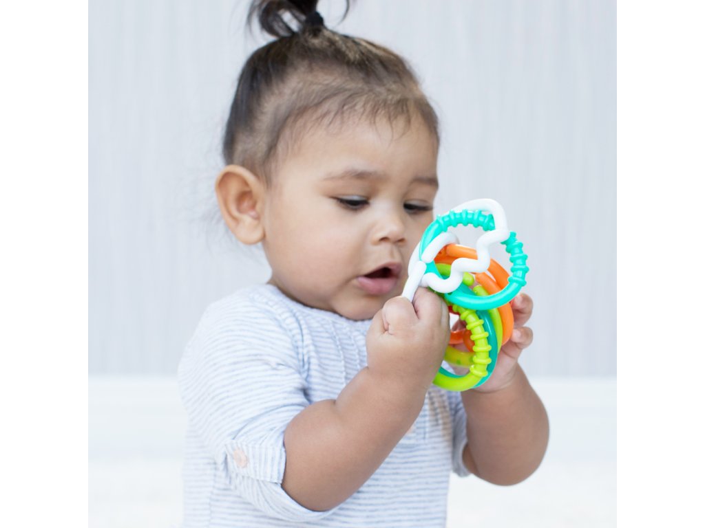 Ľahká a ľahko uchopiteľná hrkálka pre najmenších je tvorené z ôsmich navzájom prepojiteľných krúžkov, ktoré môžete rôznymi spôsobmi spájať aj používať samostatne. Každý krúžok ponúka inú textúru na skúmanie rukami aj ústami.