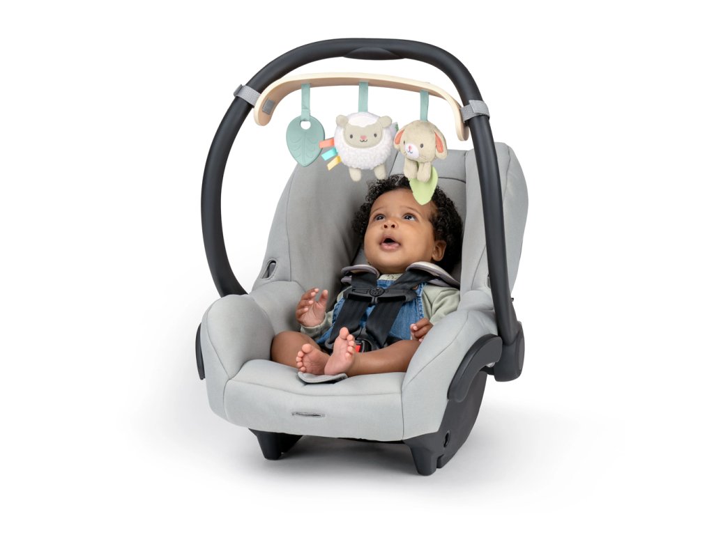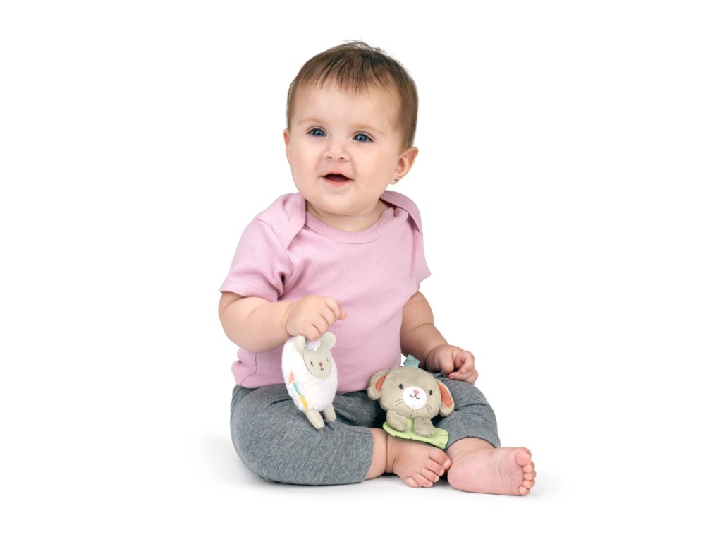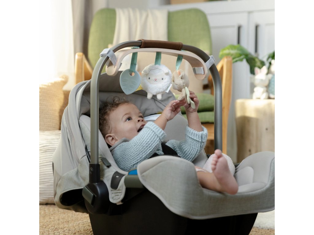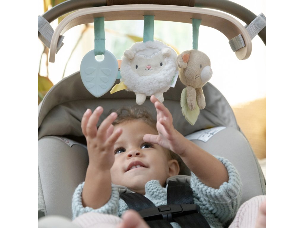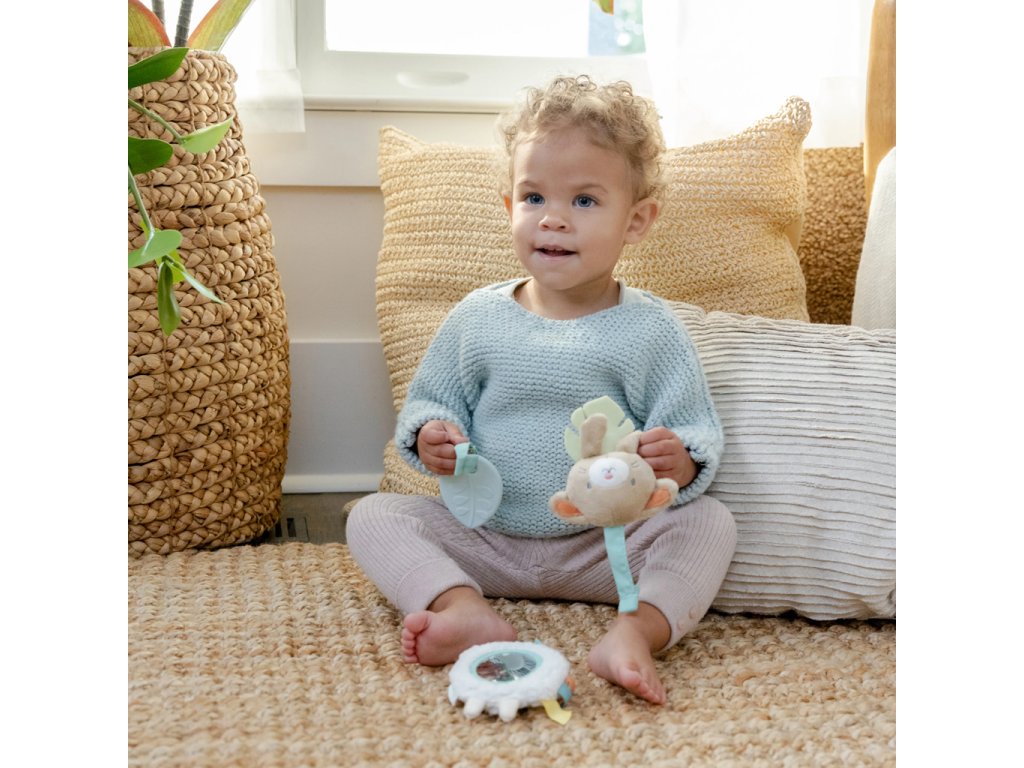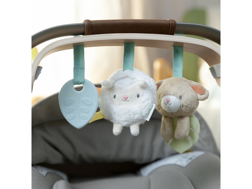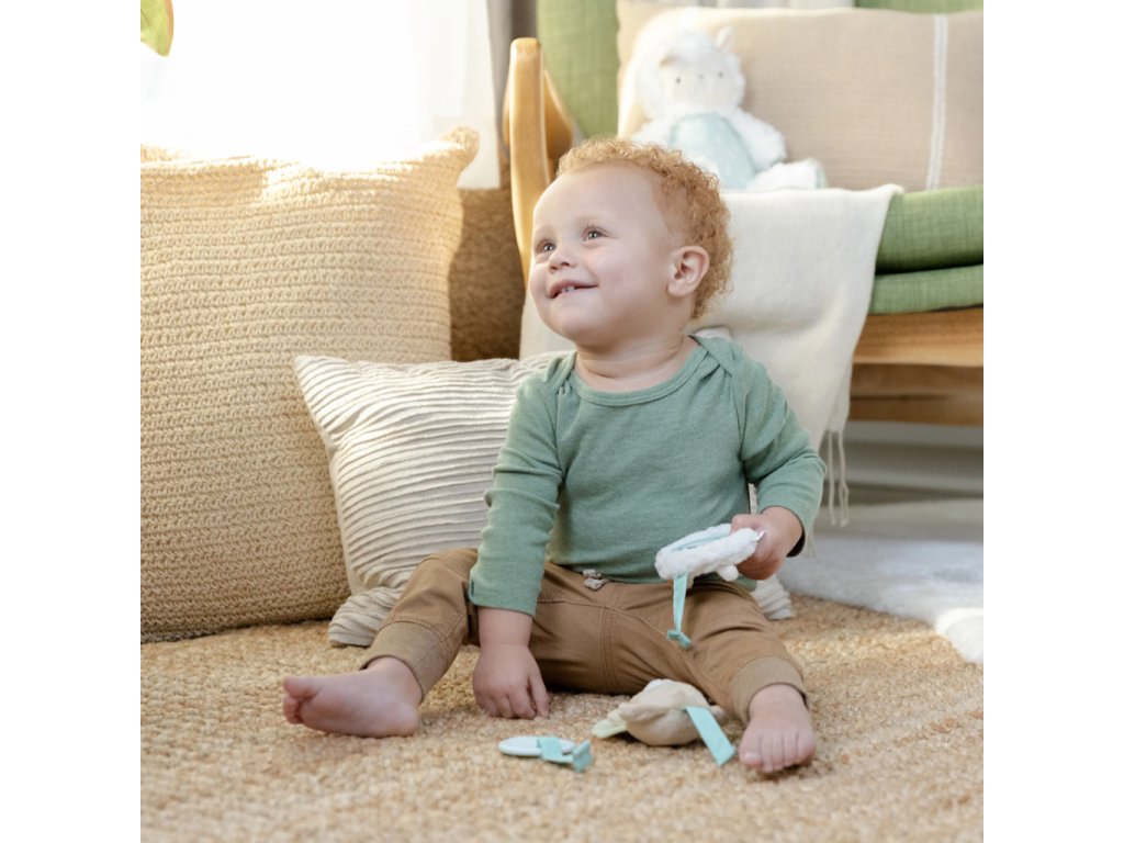 - Obsahuje 3 odnímateľné hračky: silikónový lístok, plyšovú ovečku Sheppy™ so zrkadlom a senzorickými štítkami, a zajačika Sylvi™ s textúrovaným lístkom