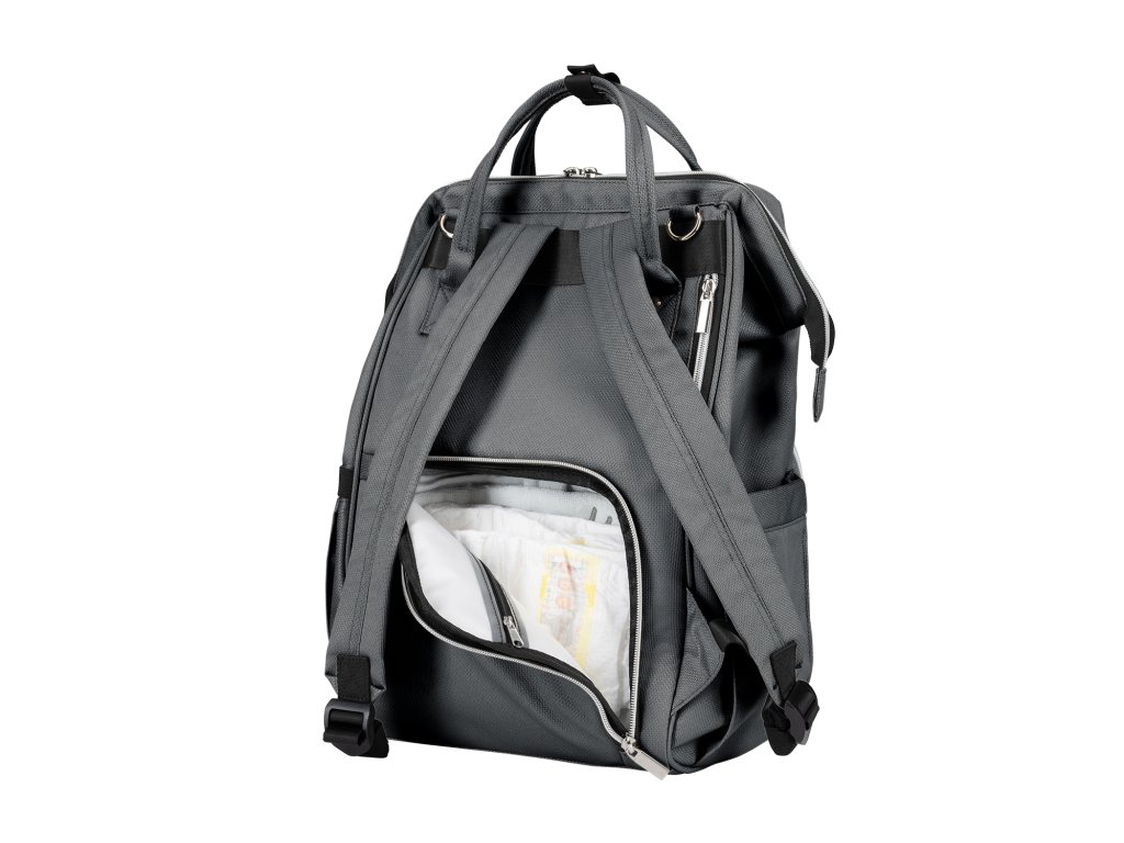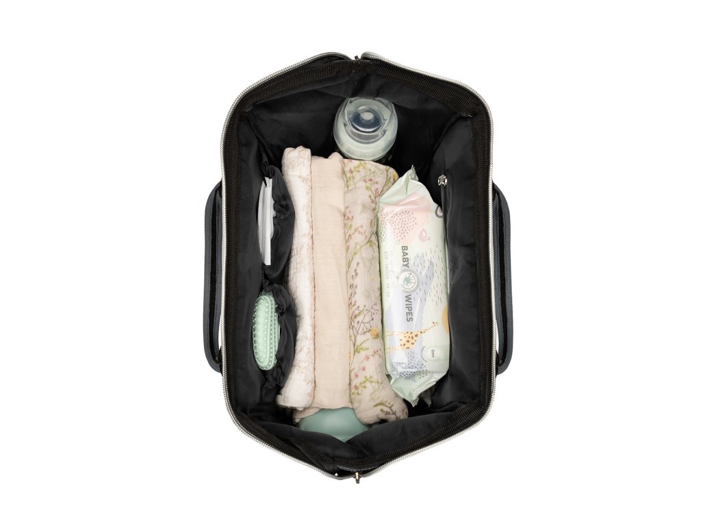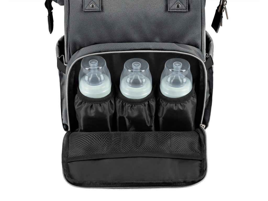 Vnútri batohu nájdete množstvo vreciek a priehradok aj vodeodolné vrecko na uloženie vlhkých predmetov. Široký spôsob otvárania batohu uľahčuje orientáciu v uloženom obsahu. Na vonkajšej strane nájdete vrecká s uzatváraním na zips aj vrecko na uloženie fľaše. Termoizolačné vrecká na fľaše pomáhajú udržať nápoje či mlieko dlhšiu dobu v optimálnej teplote. Súčasťou plecniaka je aj prebaľovacia podložka.