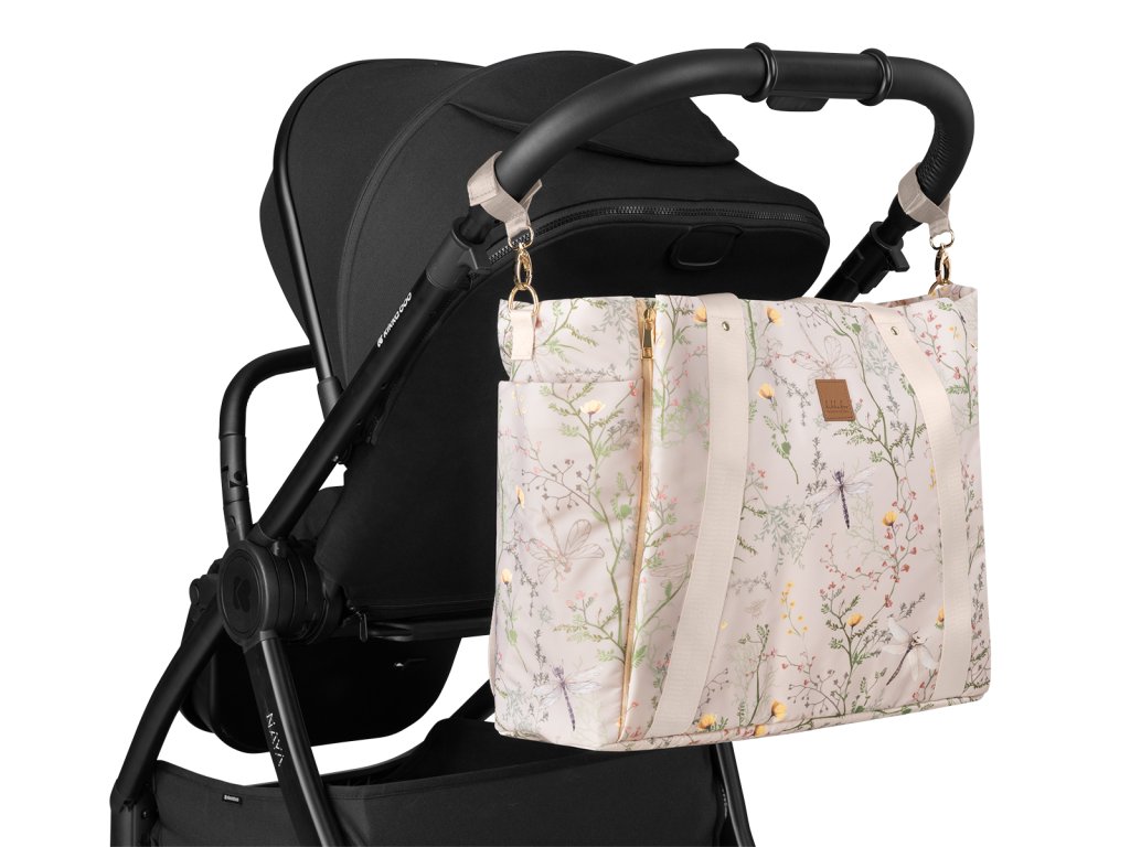 Štýlová prebaľovacia taška umožňuje prehľadné uloženie všetkého potrebného na prechádzky a výlety s vašim dieťaťom. Nastaviteľné držadlá umožňujú nosiť tašku aj ako batoh na chrbte. Klipy umožňujú zavesenie na madlá kočíka.