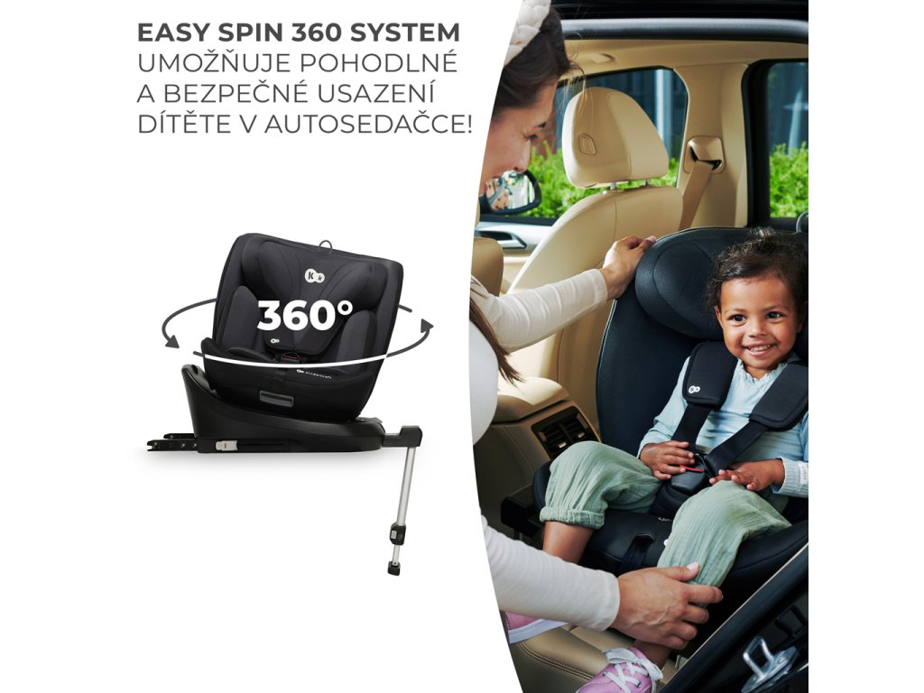 Systém EASY SPIN 360° uľahčuje nielen pripútanie dieťaťa v detskej sedačke pomocou vnútorných popruhov. Umožňuje tiež rýchlu zmenu nastavenia (RWF a FWF) bez toho, aby ste celú detskú sedačku museli vybrať z auta. Na to aby ste vaše dieťa posadili a pripútali, stačí keď odblokujete bezpečnostnú západku a otočíte sedačku smerom k sebe, alebo otočte sedačku dopredu v smere jazdy.