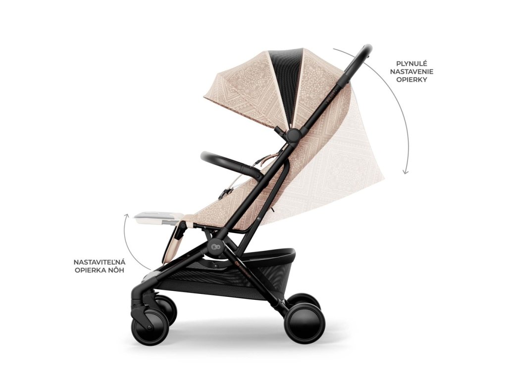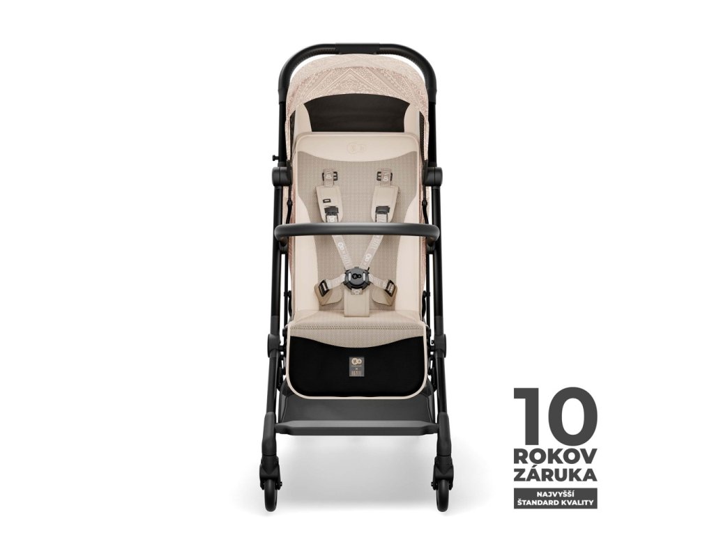 Magnetické, päťbodové bezpečnostné pásy zaručujú bezpečnosť a jednoduché používanie - zapnutie a odopnutie trvá len chvíľu. Bezpečnostný pás je tiež vybavený pohodlným výškovým nastavením, ktoré vám umožní prispôsobiť ho výške dieťaťa alebo hrúbke oblečenia bez toho, aby ste ho museli znova zapínať. Otočný nárazník, ktorý sa dá z oboch strán odobrať, navyše uľahčuje nakladanie a vyberanie dieťaťa z kočíka a poskytuje rodičom maximálny komfort.
