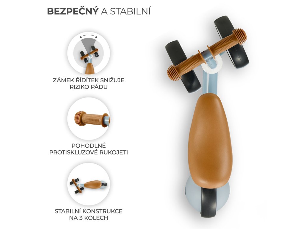 CUTIE je mini-trojkolka, ktorá je spojením originálneho, moderného dizajnu, bezpečnej konštrukcie a výhod balančného bicykla a trojkolky. Bol vytvorený špeciálne pre malých prieskumníkov. Je vhodný pre deti od 1 roka! Protišmykové gumové rukoväte TPR poskytujú dieťaťu pevné uchopenie a nízka hmotnosť (iba 1,8 kg) umožňuje mini bicykel rodičom ľahko prenášať. Ľahké kolieska z protiporeznej peny EVA a nastaviteľná výška sedadla (26-28 cm) urobia každú prechádzku nezabudnuteľnou!