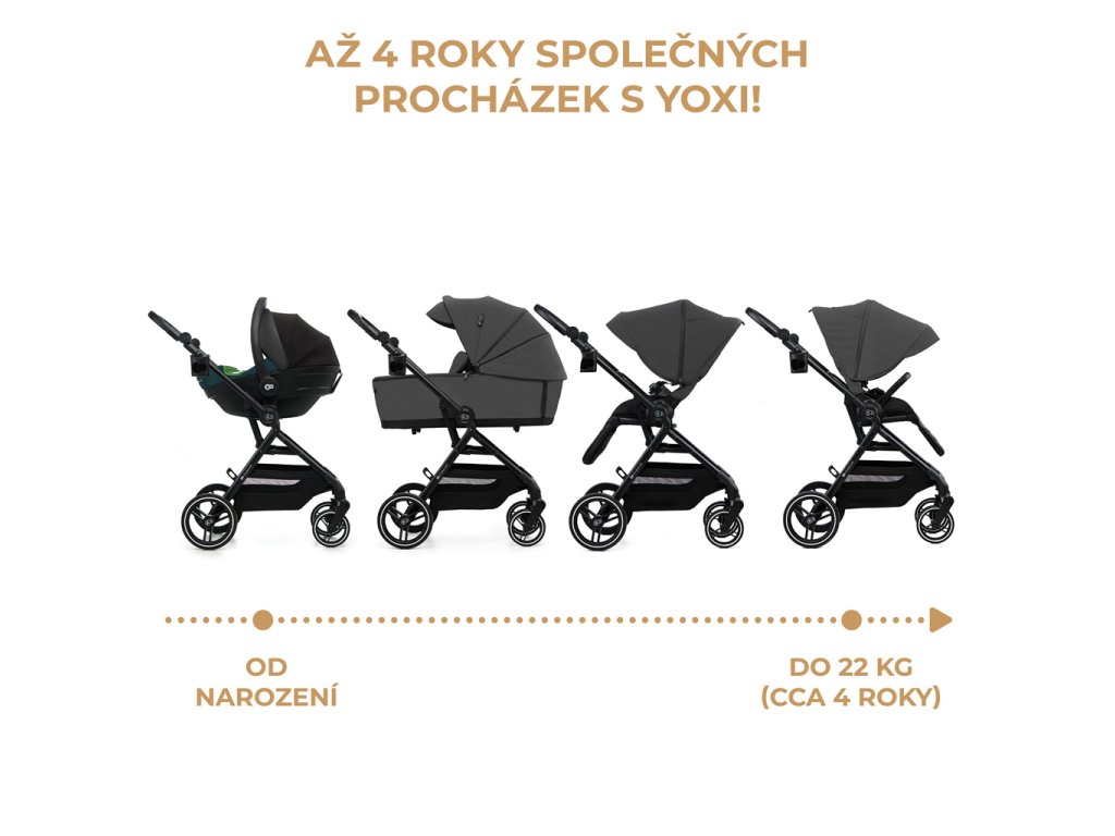 Kočík YOXI 3 v 1 bol vytvorený pre deti od narodenia do približne 4 rokov (22 kg). Veľká pohodlná vanička s mäkkým matracom bola navrhnutá špeciálne pre bábätká, a keď dieťa vyrastie, môžete ju jednoducho vymeniť za športovú sedačku, ktorú je možné používať v smere alebo proti smeru jazdy.