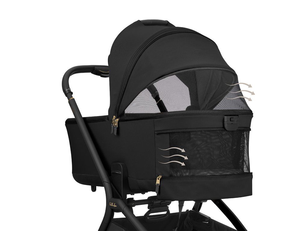 Pre pohodlie dieťaťa je súčasťou obojstranný mäkký matrac so zimnou stranou z kvalitného zamatového materiálu a letnou stranou z priedušnej sieťoviny pre lepšiu ventiláciu. Strieška má zipsové predĺženie, slnečnú clonu a dopĺňa ju extra slnečná clona pre maximálny tieň. Ventiláciu zaisťujú sieťované vetracie otvory na strieške aj v oblasti hlavy. Praktická je aj vrecko na telefón na zips.Vodeodolný textilný materiál s UPF 50+ chráni dieťa pred poveternostnými vplyvmi a slnečným žiarením.