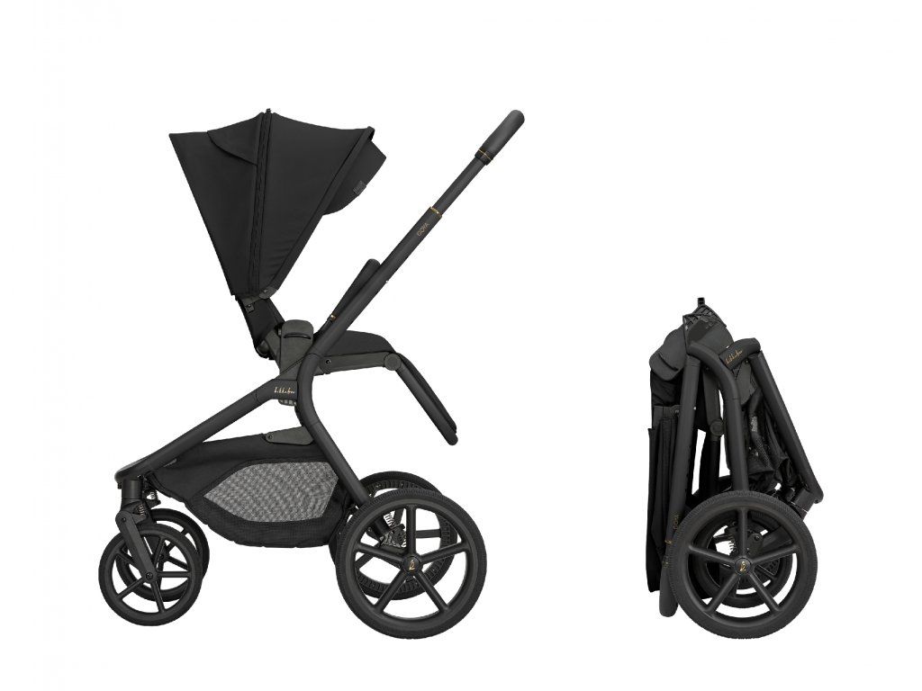 Po zložení kočík samostatne stojí. Pre ľahké prenášanie je pripravený popruh cez rameno a madlo.