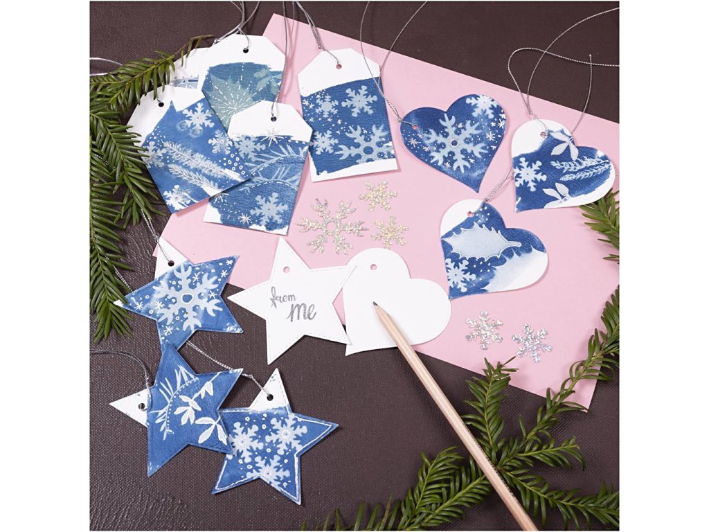 Elegantná kreatívna sada pre dospelých, ktorá prináša kúzlo výtvarnej techniky kyanotypie priamo k vášmu vianočnému baleniu darčekov. Vytvorte si vlastné originálne visačky v odtieňoch modrej - jedinečné, štýlové a osobné.