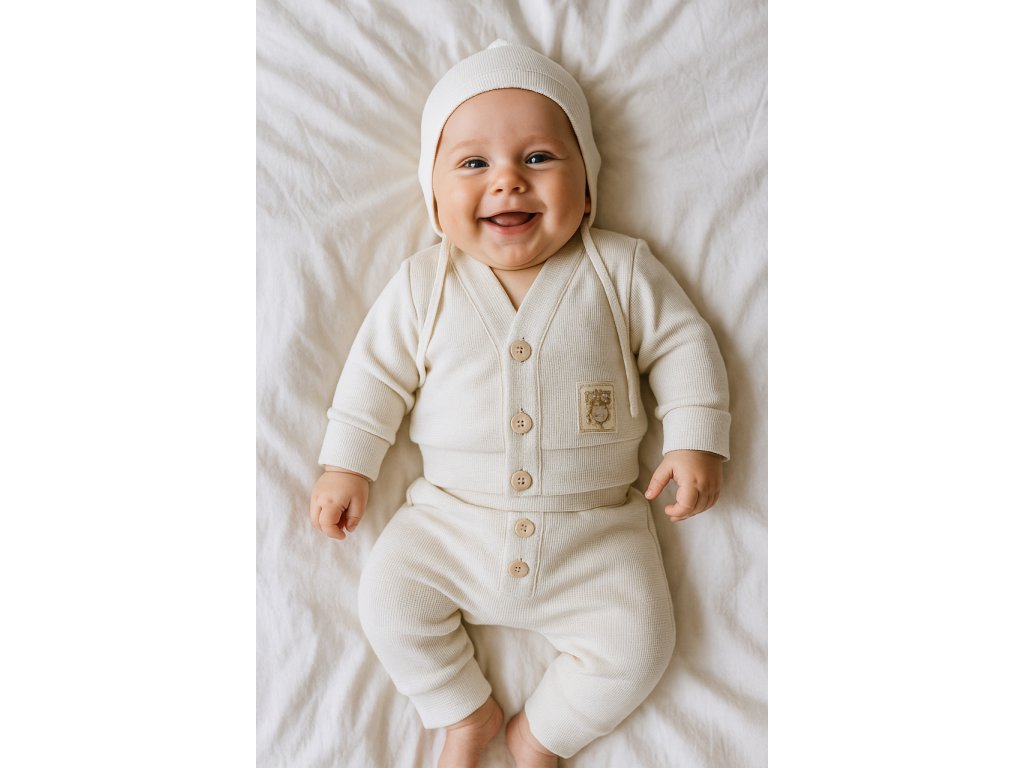Kabátik na gombíky pre ľahké obliekanie. Nohavice majú v páse mäkkú gumu, aby netlačila bábätko na bruško. Čiapočka na šnúrky.