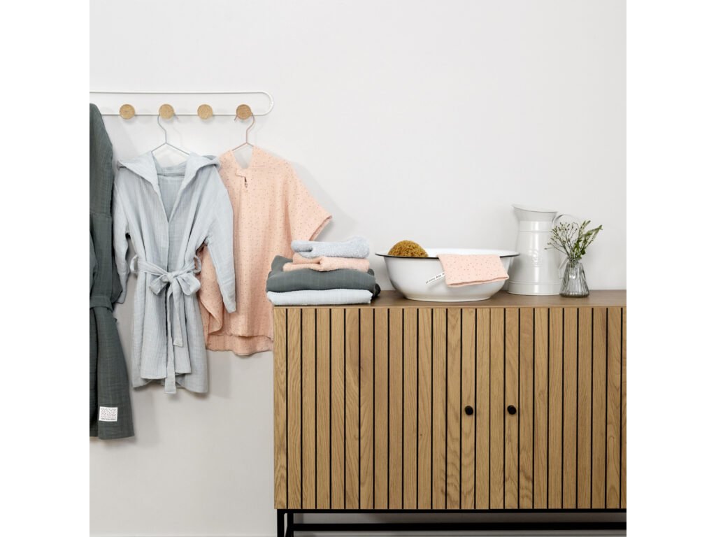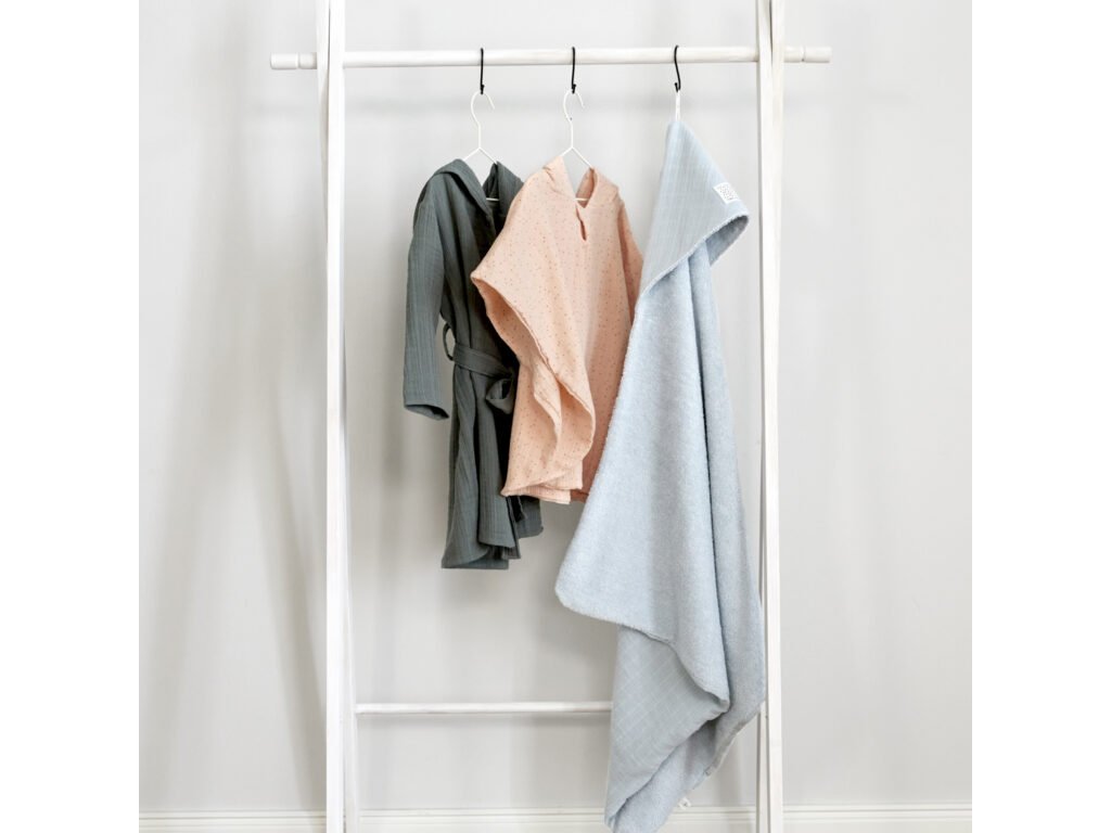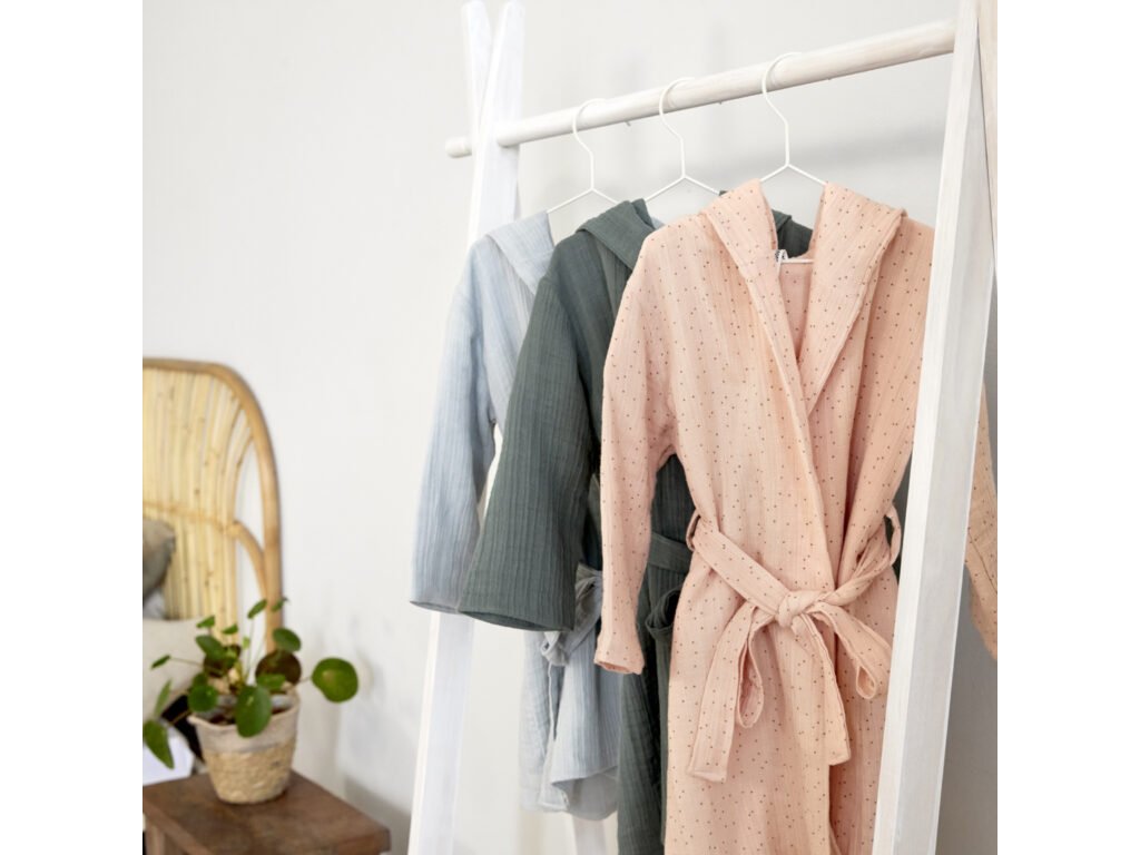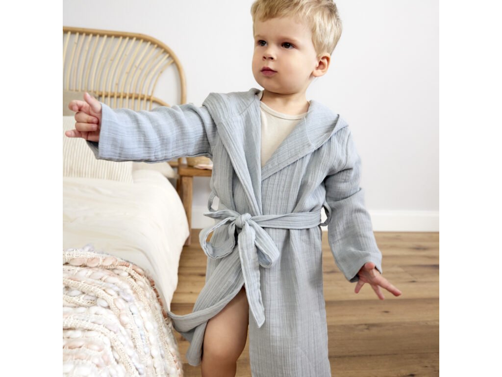 Detský kúpací plášť je vyrobený z dvojvrstvového predpraného mušelínu, je priedušný a jemný k detskej pokožke. Kapuca chráni hlavu a krk dieťaťa a udržuje ju tak v teple. Plášť je vybavený opaskom. Materiál aj strih zaisťujú komfortný pocit pri nosení. Určené deťom vo veku 2 až 3 roky.
