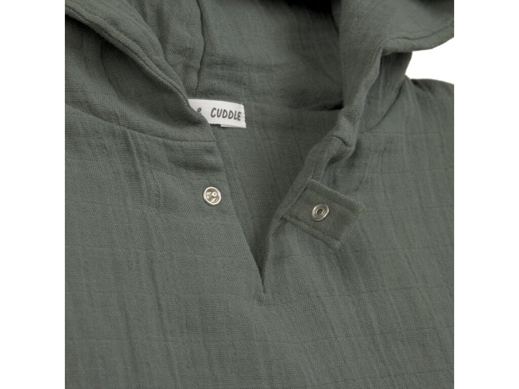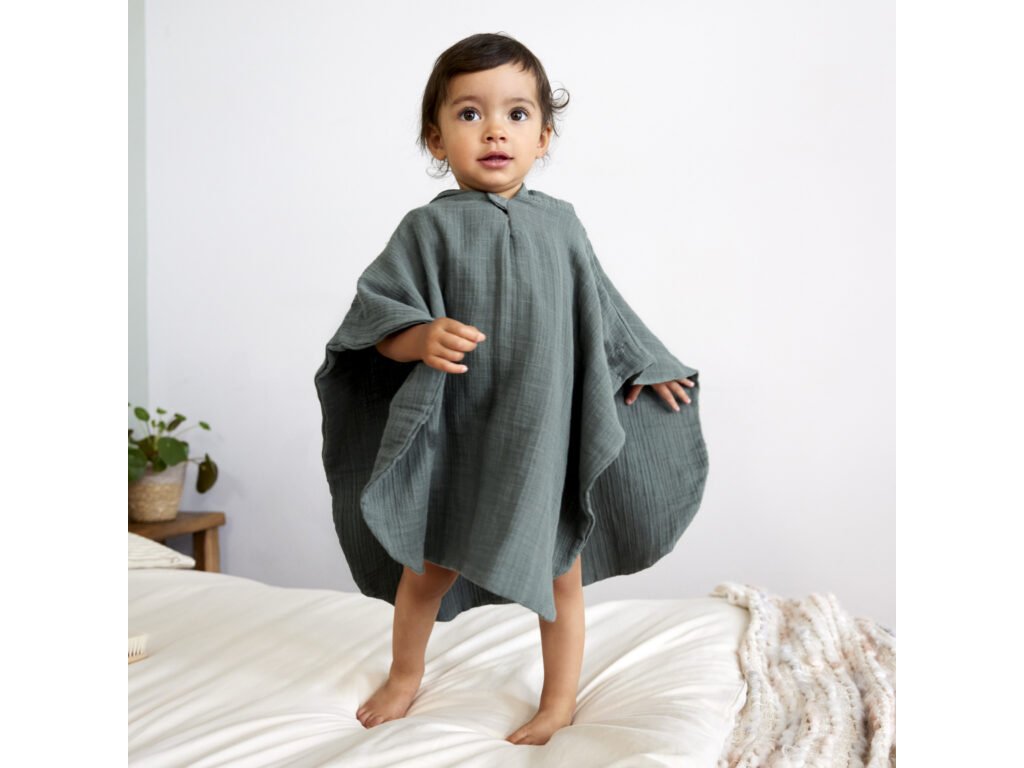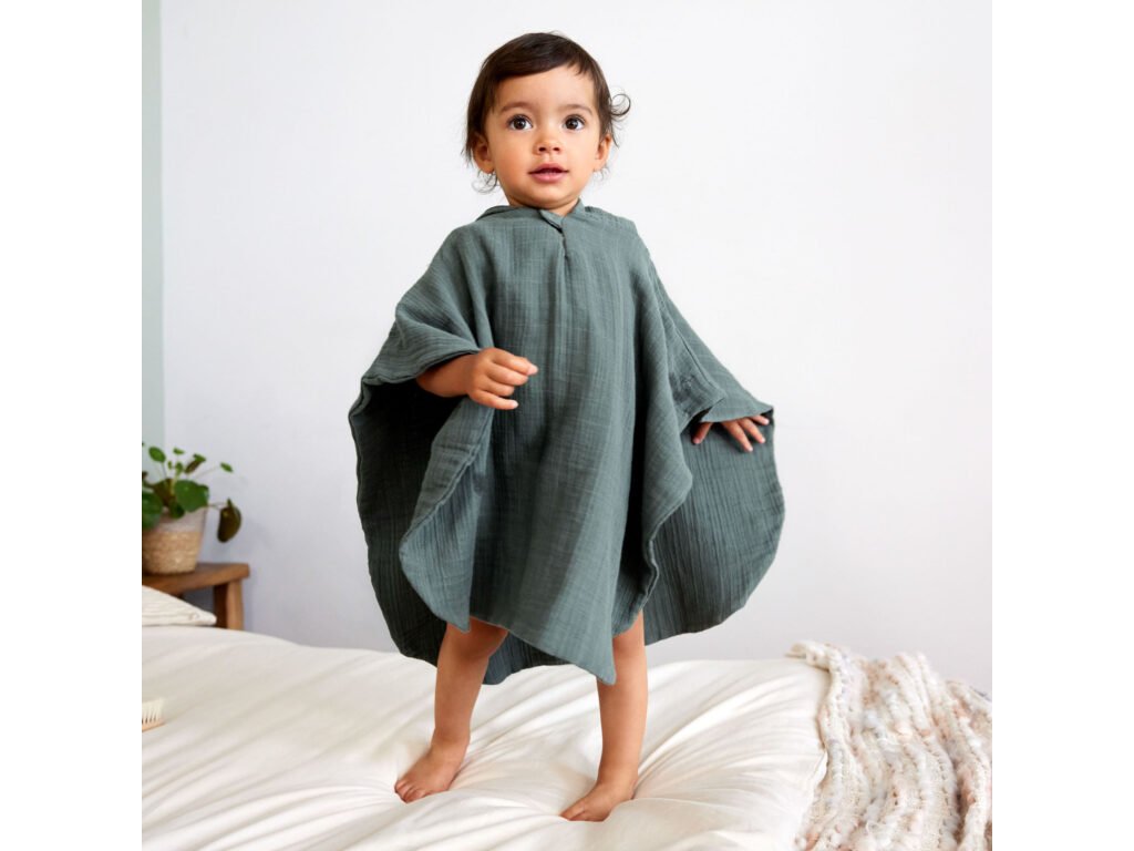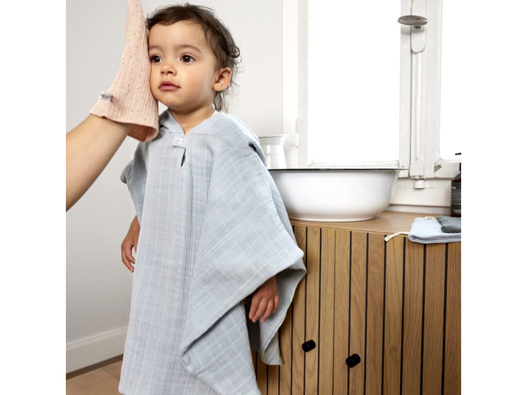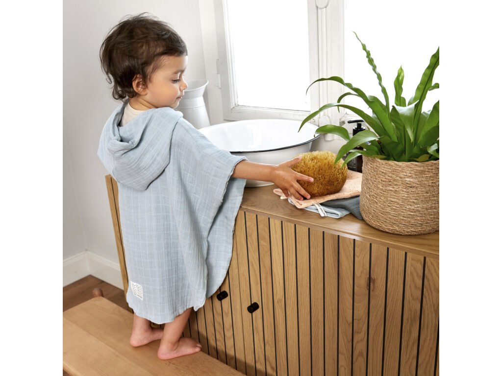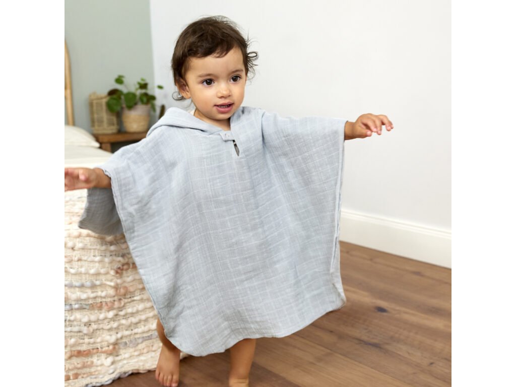 Poncho je vyrobené z dvojvrstvového predpraného mušelínu, ktorá je priedušná a jemná k detskej pokožke. Kapuca chráni hlavu a krk dieťaťa a udržuje ju tak v teple. Poncho je ideálne tak pre každodenný domáci kúpeľ, tak pre plávanie v bazéne, či pobyt na pláži. Je určené deťom od 1 roku do 3 rokov.