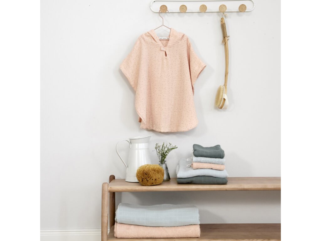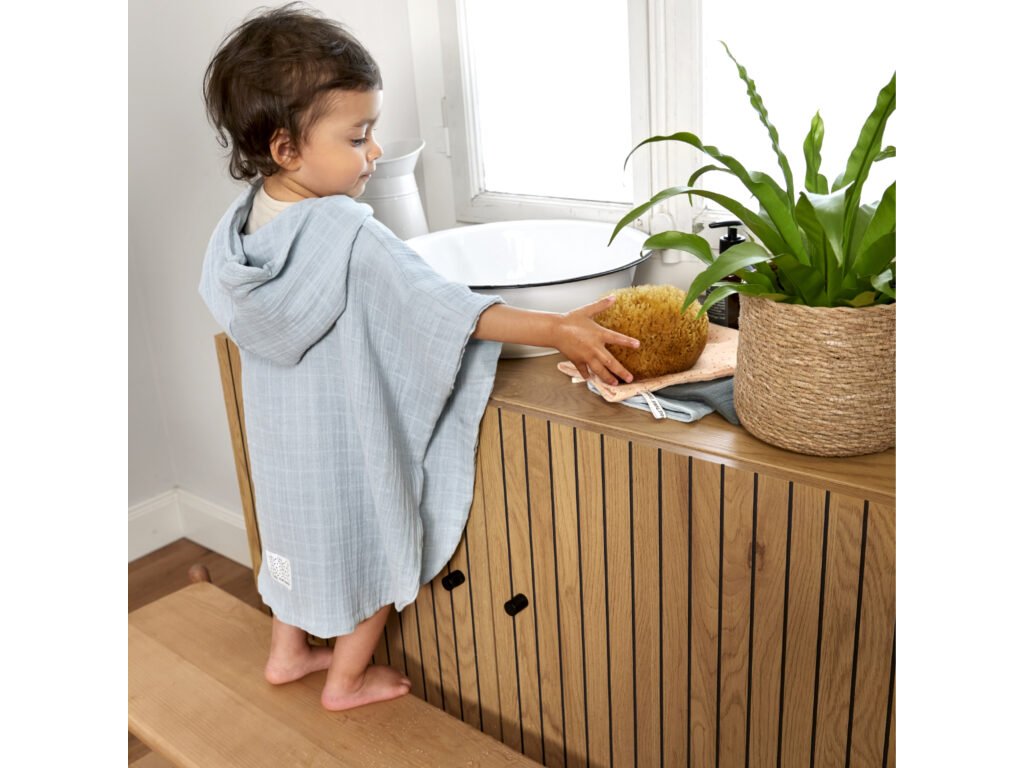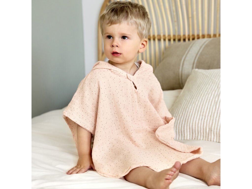 Poncho je vyrobené z dvojvrstvového predpraného mušelínu, ktorá je priedušná a jemná k detskej pokožke. Kapuca chráni hlavu a krk dieťaťa a udržuje ju tak v teple. Poncho je ideálne tak pre každodenný domáci kúpeľ, tak pre plávanie v bazéne, či pobyt na pláži. Je určené deťom od 1 roku do 3 rokov.