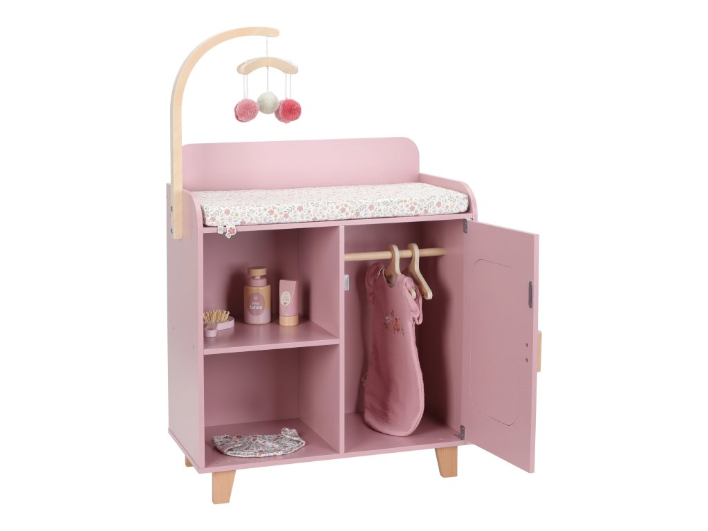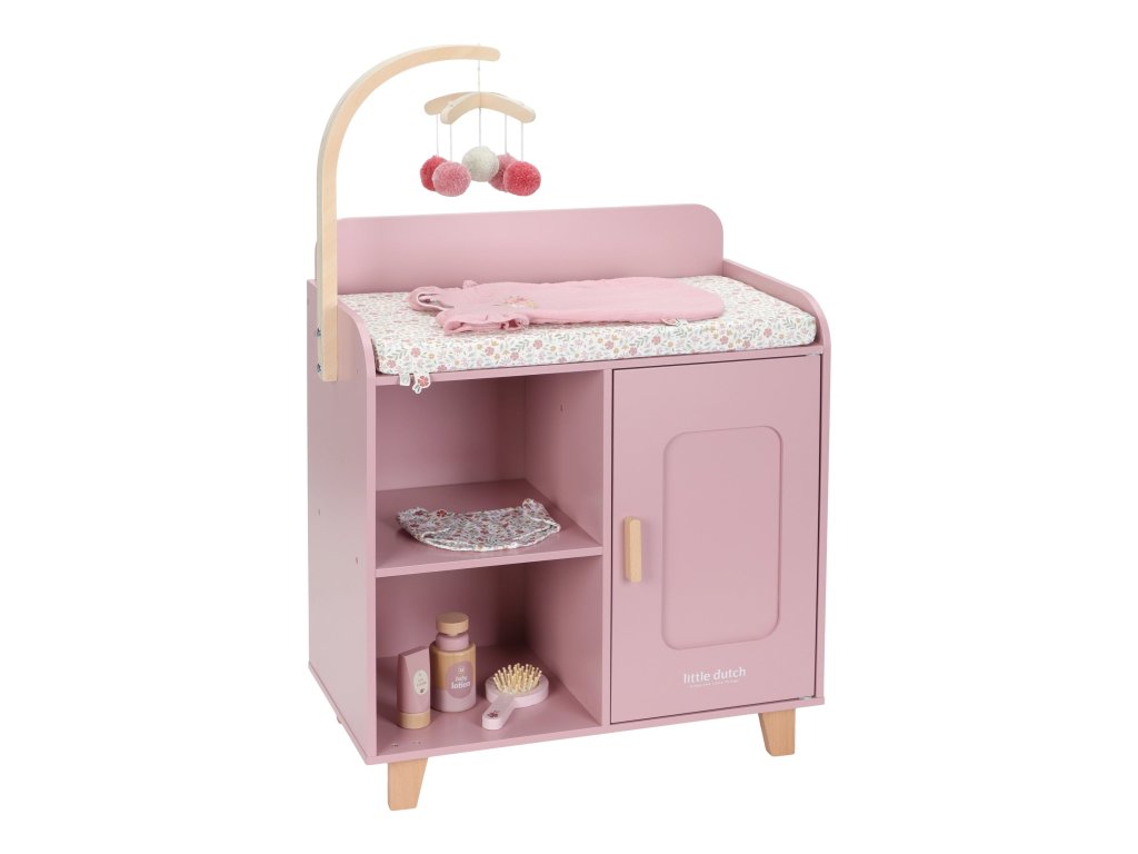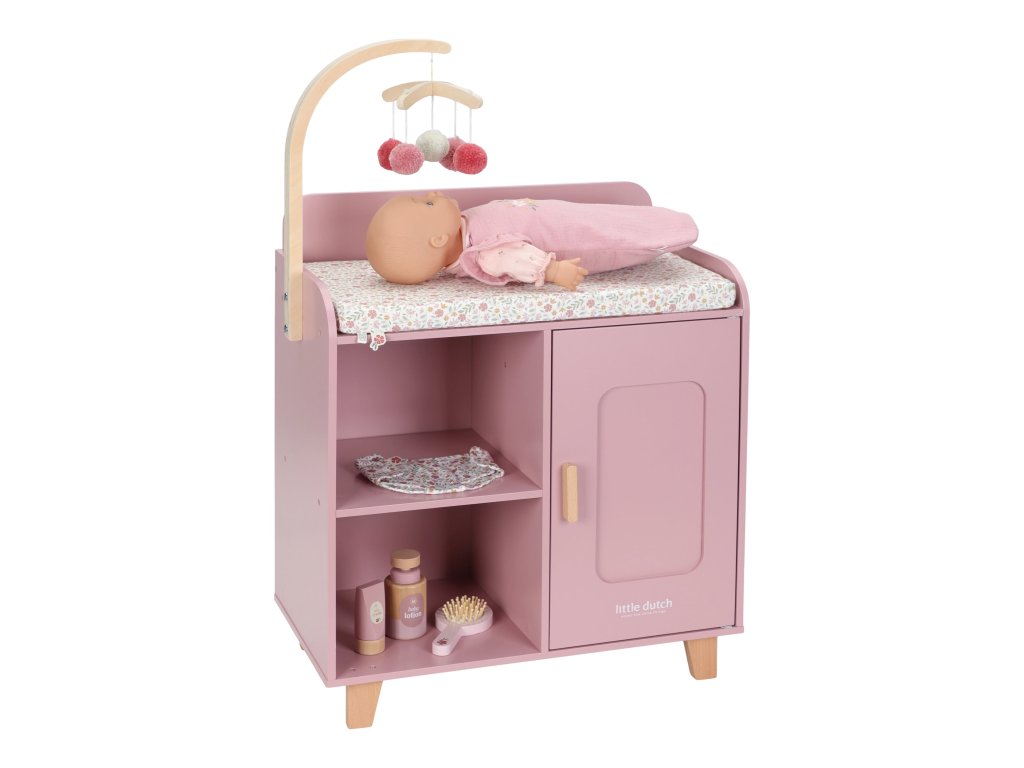 Elegantný prebaľovací pult Little Dutch umožňuje deťom napodobňovať každodennú starostlivosť o bábätko a starať sa o bábiky rovnako, ako sa mamička či otec starajú o svoje bábätko. Súčasťou balenia je mäkká prebaľovacia podložka s romantickou kvetinovou potlačou, závesný kolotoč, spací vak, textilná plienka, dve ramienka a drevené doplnky pre starostlivosť o bábiku. Praktická skrinka a poličky v spodnej časti prebaľovacieho pultu umožňujú mať všetko potrebné pre starostlivosť o bábiku vždy po ruke a upratané.