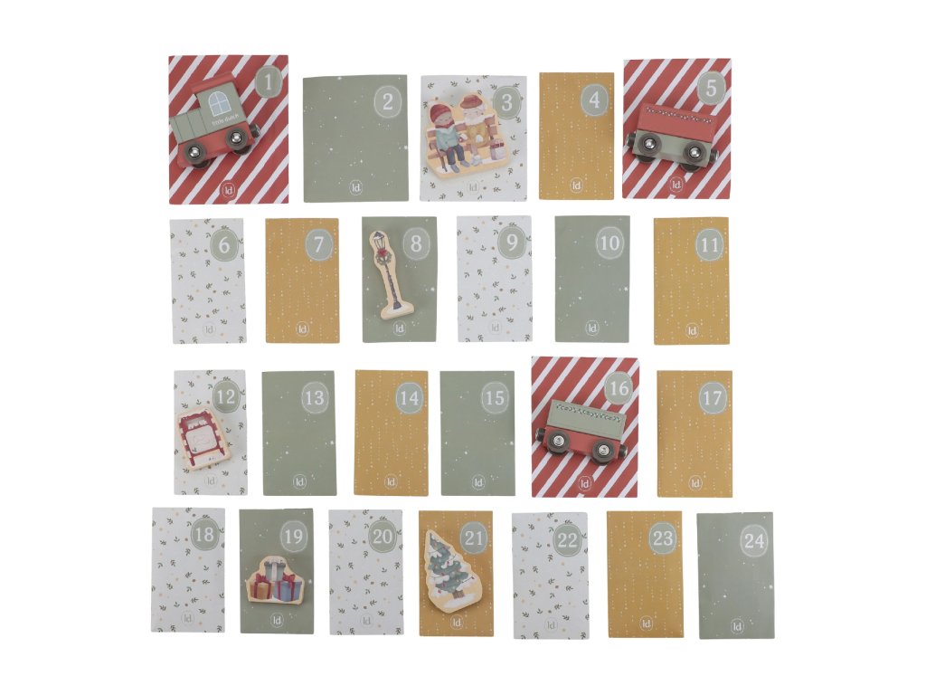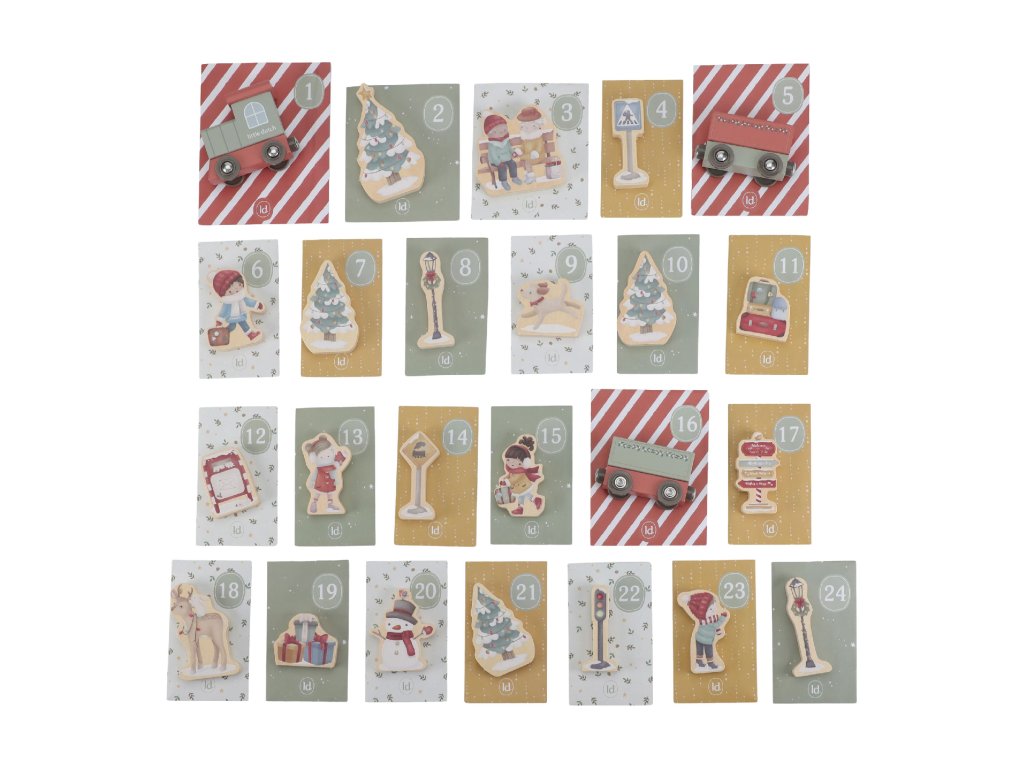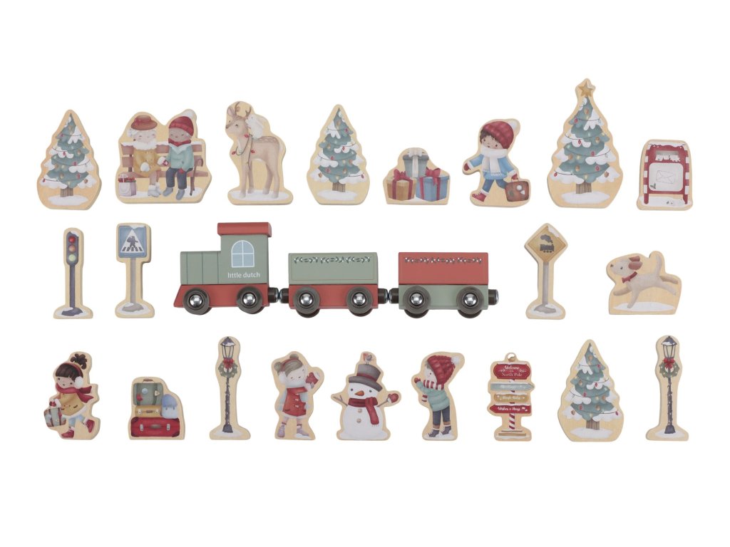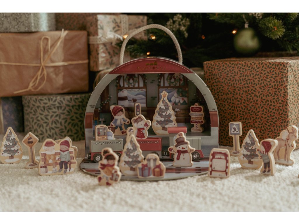 24 drevených prekvapení - každý deň v decembri objaví dieťa nový dielik - lokomotívu, stromček, soba, snehuliaka, kufre, dopravné značky a ďalšie doplnky, ktoré spoločne vytvárajú kúzelnú vianočnú scénu
