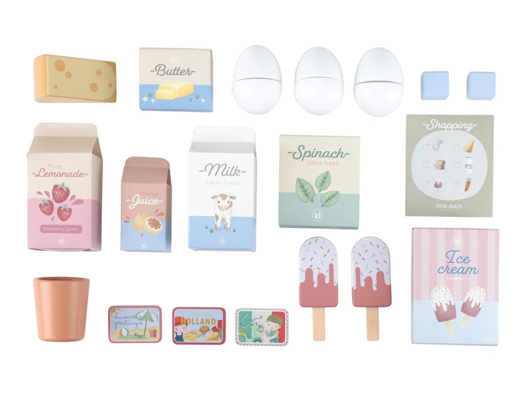 Súčasťou balenia je 19 doplnkov, ktoré sa hodia na uloženie do chladničky: maslo, syr, 3 vajcia, 2 kocky ľadu, limonáda, džús, mlieko, mrazený epenát, 3 zmrzliny, téglik, 3 magnety na chladničku a nákupný zoznam.