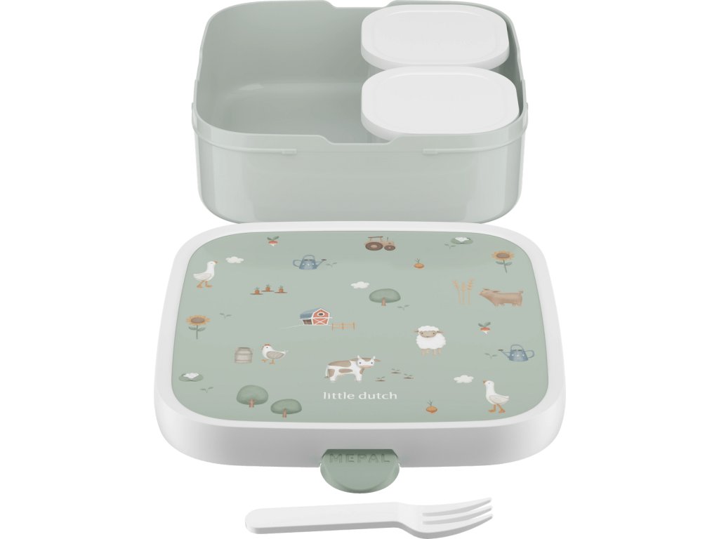 Veľký desiatový box má vo vnútri dve vyberateľné krabičky s viečkom na oddelenie jednotlivých častí uloženej desiaty. Súčasťou boxu je aj malá vidlička, ktorá je ideálna na napichovanie kúskov ovocia či zeleniny. Zacvakávací uzáver je zárukou bezpečného uzavretia obsahu boxu.