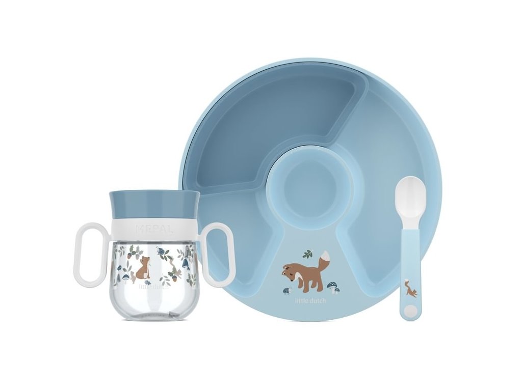 3-dielna jedálenská súprava v krásnom dizajne s jemnou potlačou obsahuje detský delený tanier, trénovací hrnček so systémom 360 ° a lyžičku.