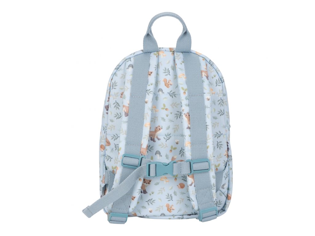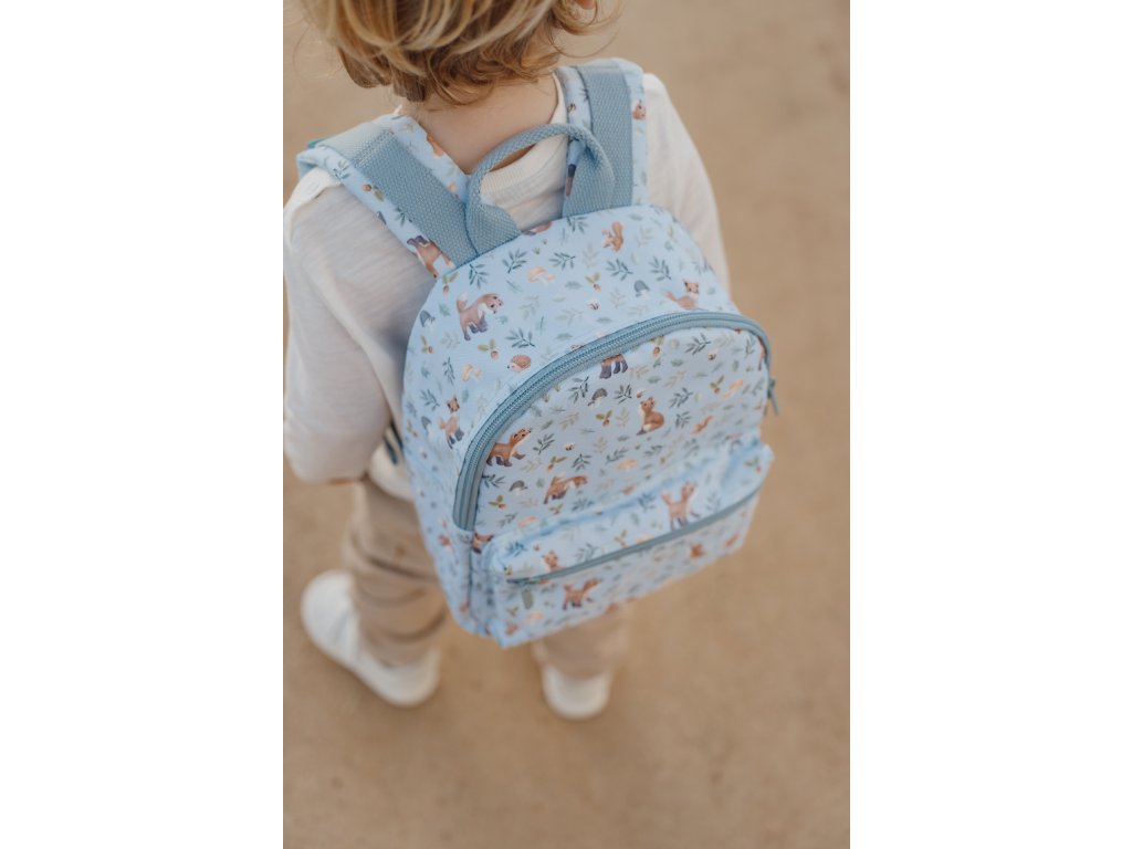 Rozkošný detský batoh potlačený obrázkami zvieratiek a motívmi zo života v lese je ideálnym doplnkom na výlety do prírody i prechádzky mestom. Batoh má nastaviteľné ramenné popruhy a hrudný pás na príjemné nosenie. Držadlo umožňuje prenášanie v ruke. Batoh je vybavený vonkajším vreckom na zips na uloženie drobností a vnútorný priestor s vreckom, elastickým držiakom na pitie a menovkou.