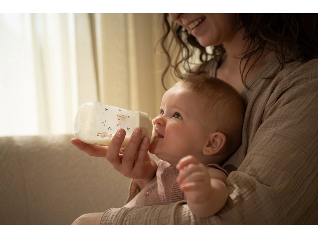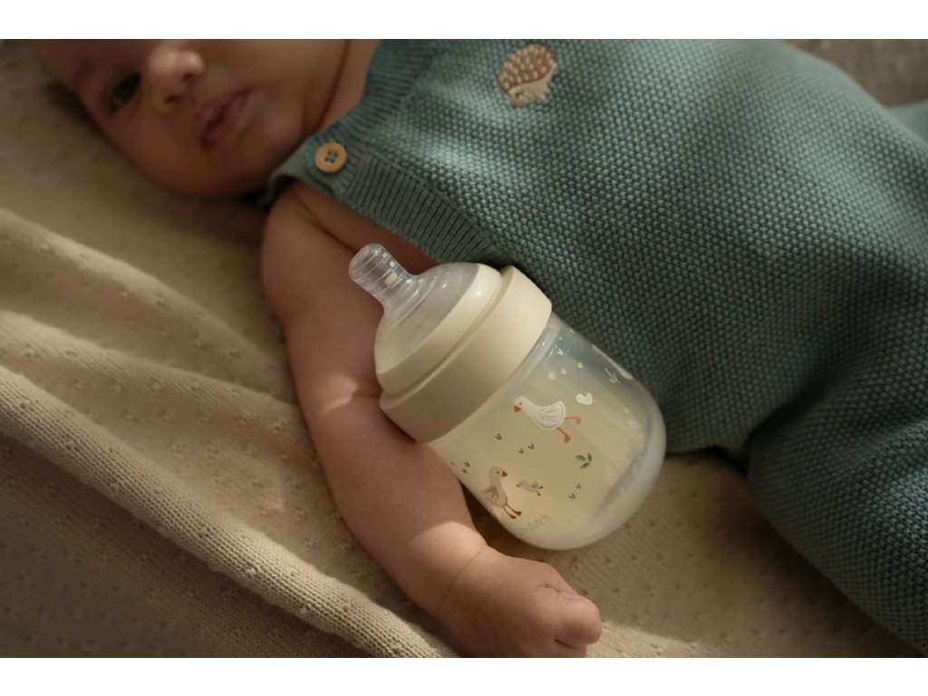Sada dojčenských fliaš Little Dutch s krásnou potlačou a cumlíkom s antikolikovým ventilom obsahuje dve fľaše (165 ml a 240 ml) so cumlíkom s pomalým prietokom, vhodné pre deti od narodenia, a dva cumlíky so stredným prietokom, vhodné pre deti od 3 mesiacov.