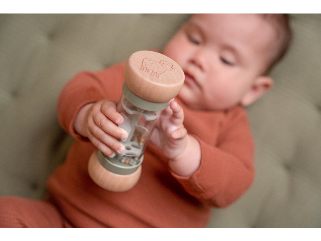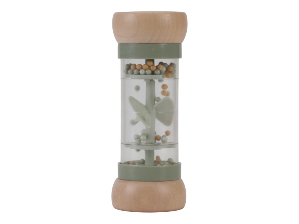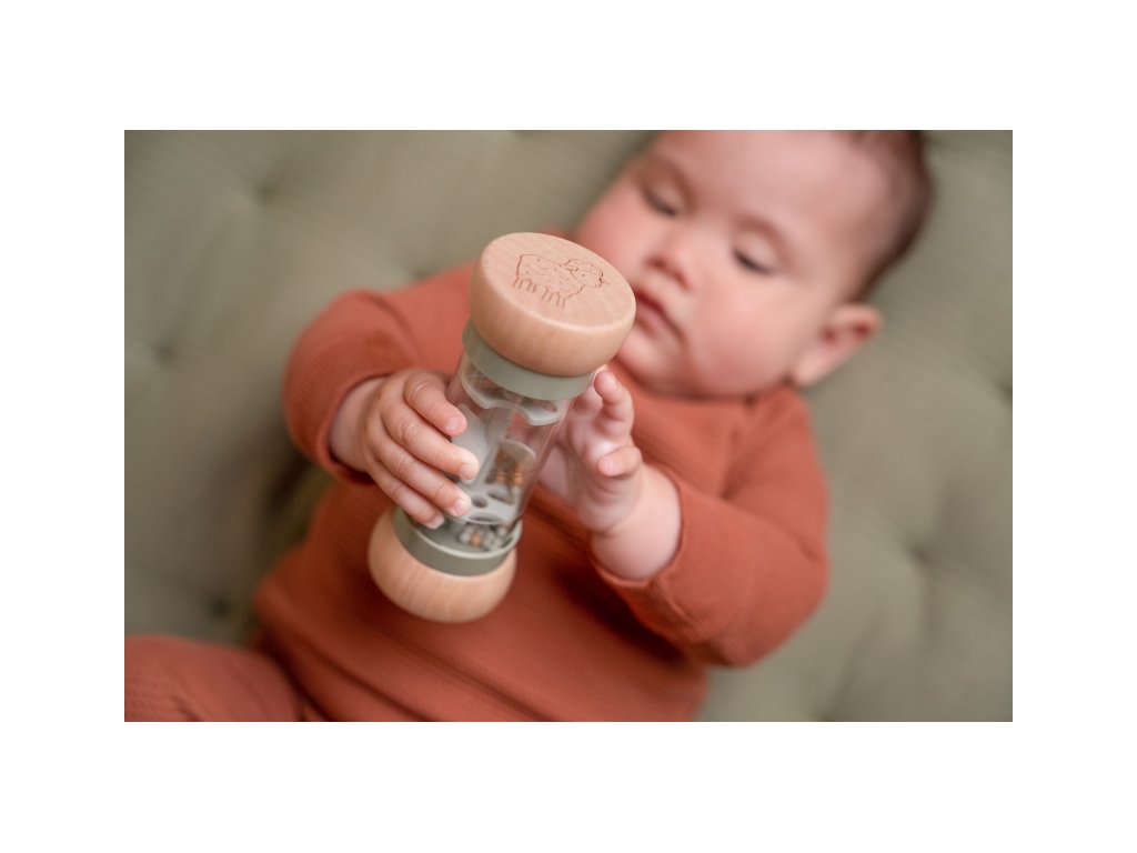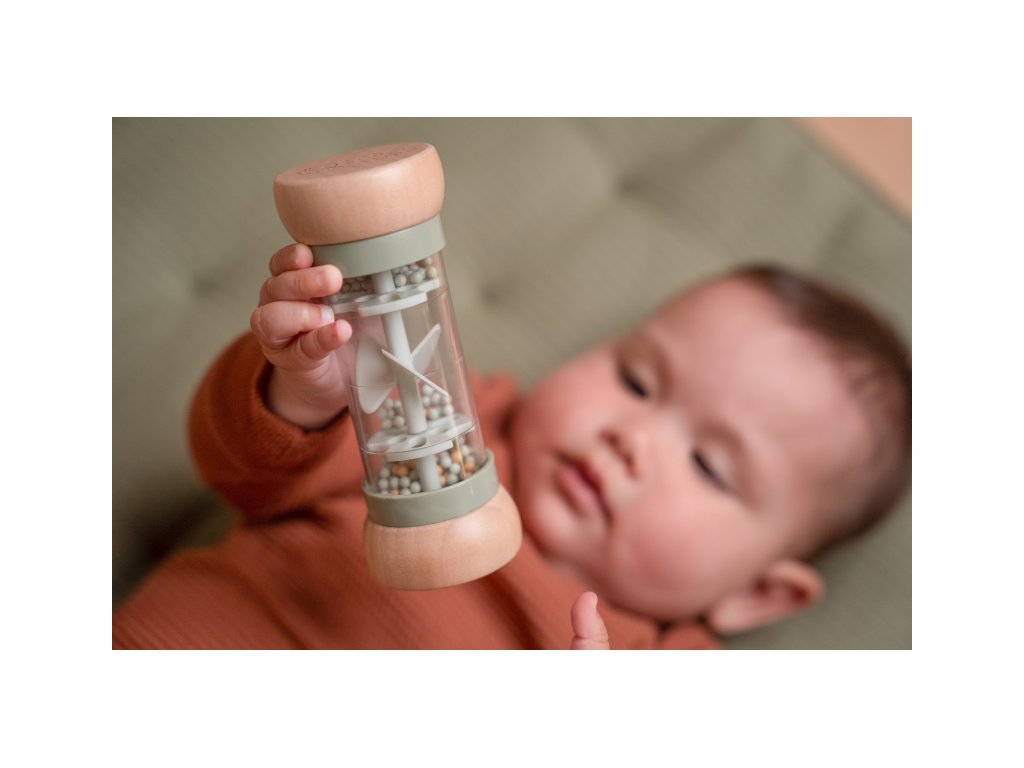 Hrkálka v krásnom prevedení v kombinácii dreva a plastu. Korálky aj otočná vrtuľa vo vnútri hrkálky pri pohybe jemne hrkajú. Tvar hračky umožňuje ľahké uchopenie detskými ručičkami.