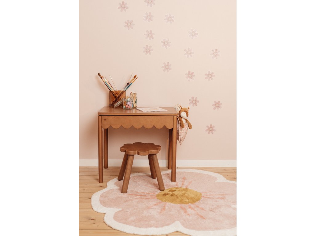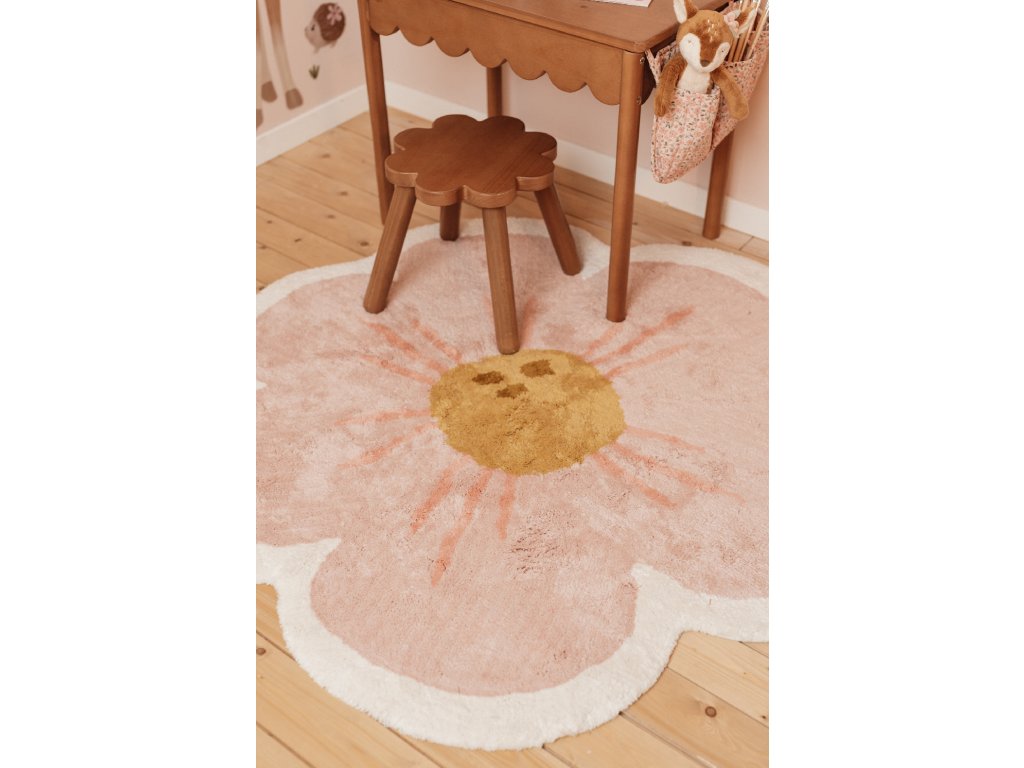 Vytvorte v detskej izbe útulnú atmosféru s koberčekom od značky Little Dutch! Koberec v tvare kvety má jemný béžový okraj s ružovými lístkami a okrovo žltým stredom.Jeho nežný dizajn vnesie do miestnosti príjemnú a útulnú náladu a vášmu dieťaťu sa na ňom bude krásne sedieť a hrať sa.