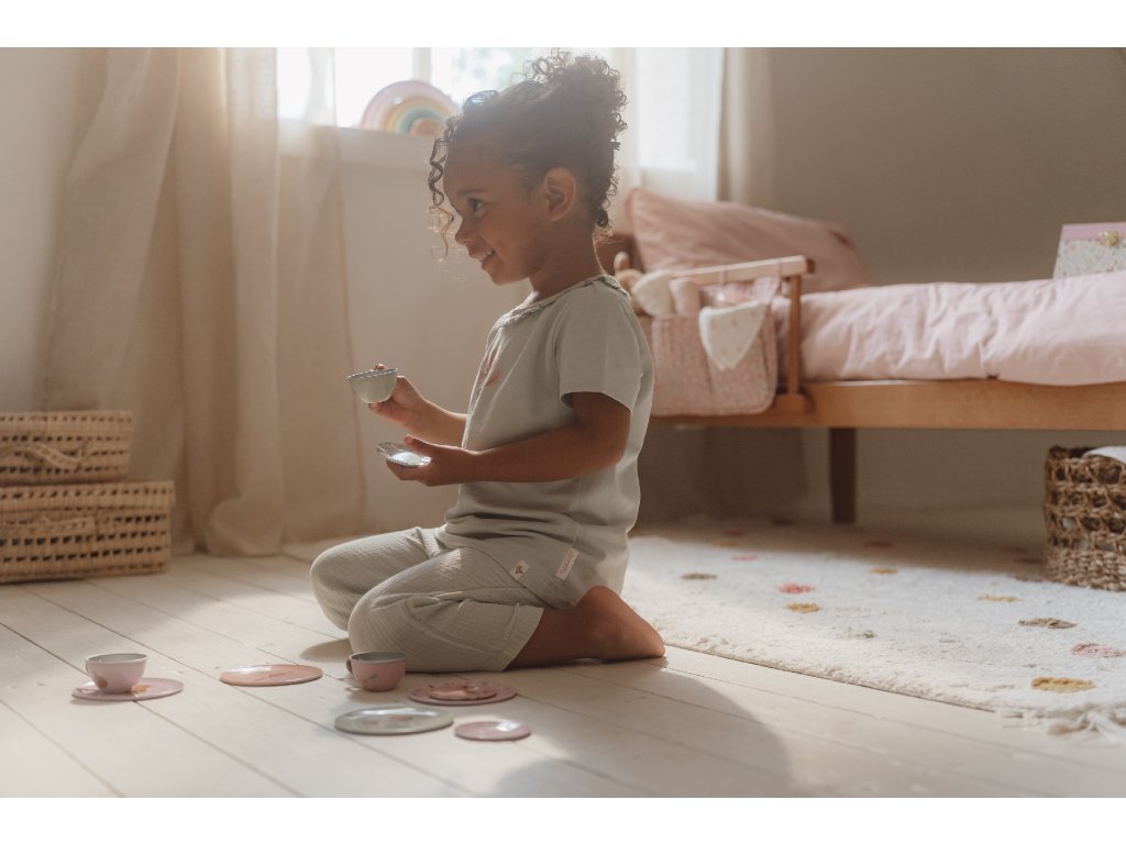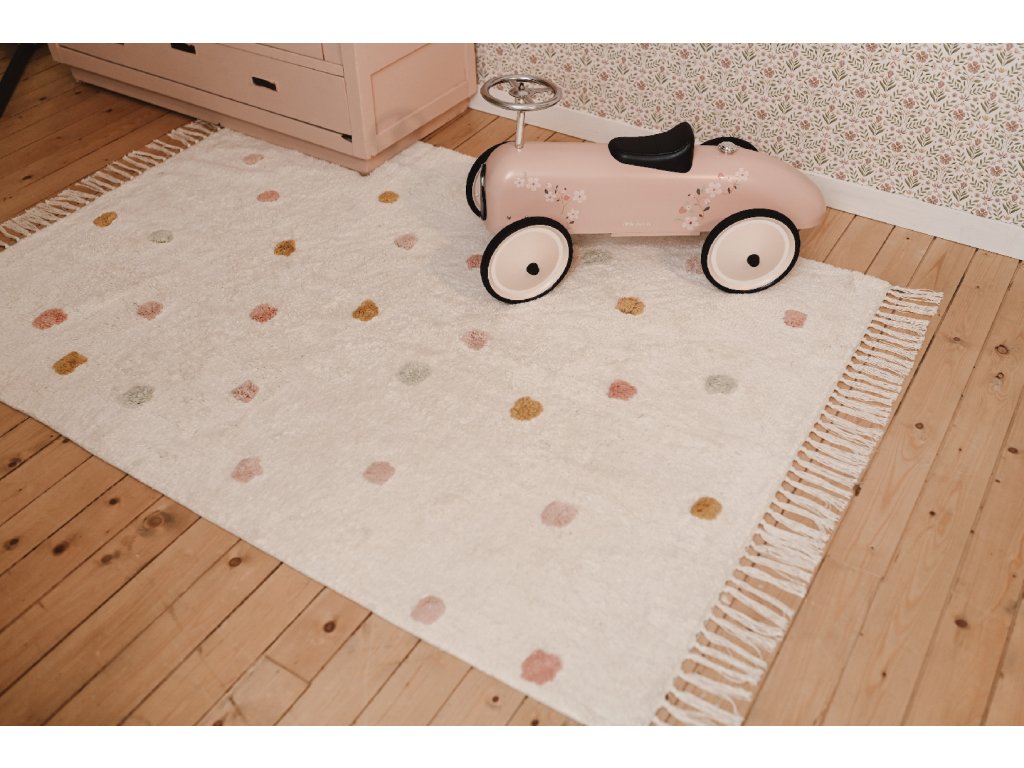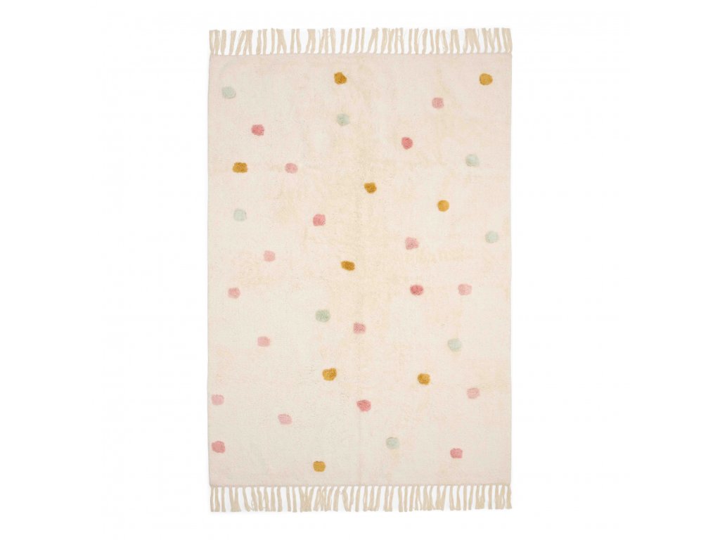 Vneste do detskej izby hrejivú a veselú atmosféru s koberčekom od značky Little Dutch! Koberec má béžový podklad zdobený hravými bodkami v ružovej, modrej a okrovo žltej farbe. Strapce na kratších stranách dodávajú designu útulný a originálny vzhľad.Vášmu dieťaťu sa na ňom bude krásne sedieť a hrať sa.