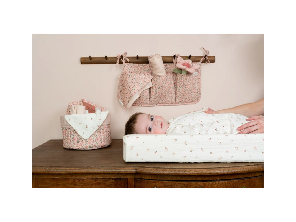 Košík s krásnou kvetinovou potlačou je vyrobený z pevného bavlneného materiálu. Využijete ho pre prehľadné uloženie všetkého, čo potrebujete mať po ruke pri každodennej starostlivosti o vaše bábätko. Košík bude zároveň krásnym doplnkom na prebaľovacom pulte či poličke v detskej izbe. Obojstranné prevedenie umožňuje voľbu vzhľadu košíka podľa vašich preferencií.