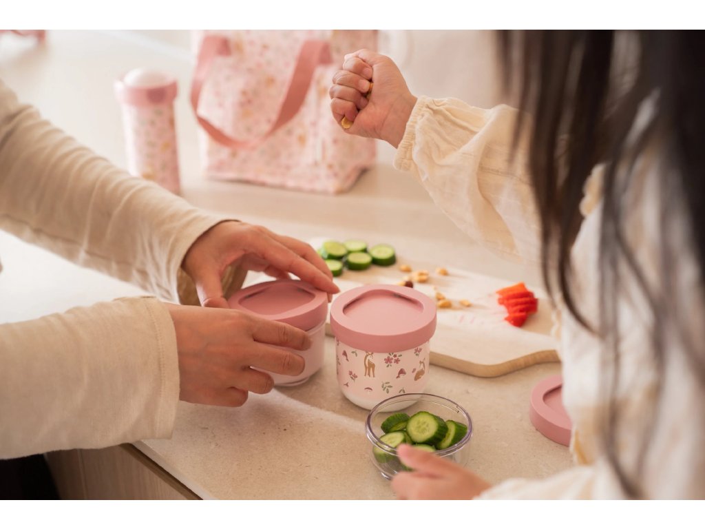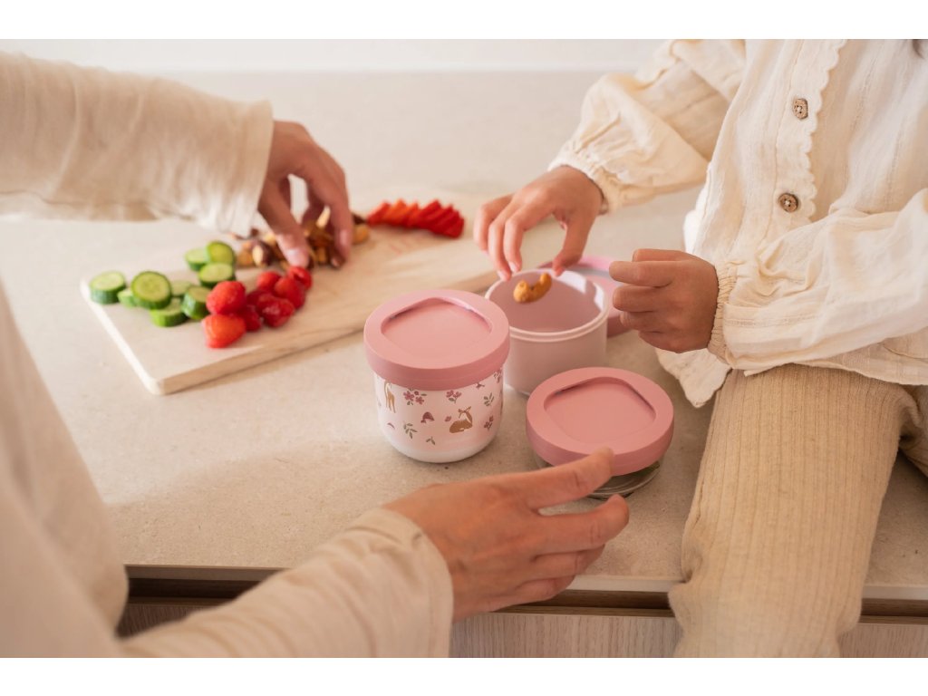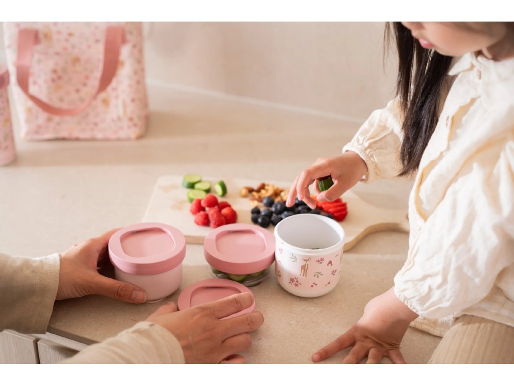 Tri praktické stohovateľné tégliky s viečkami sú ideálne na oddelené uloženie jednotlivých častí detskej desiaty. Spoľahlivé tesniace viečko chráni obsah pred vysypaním. Pre ľahké prenášanie sa tri tégliky pevne zacvaknú k sebe. Tégliky využijete na prechádzkach, výletoch aj doma.