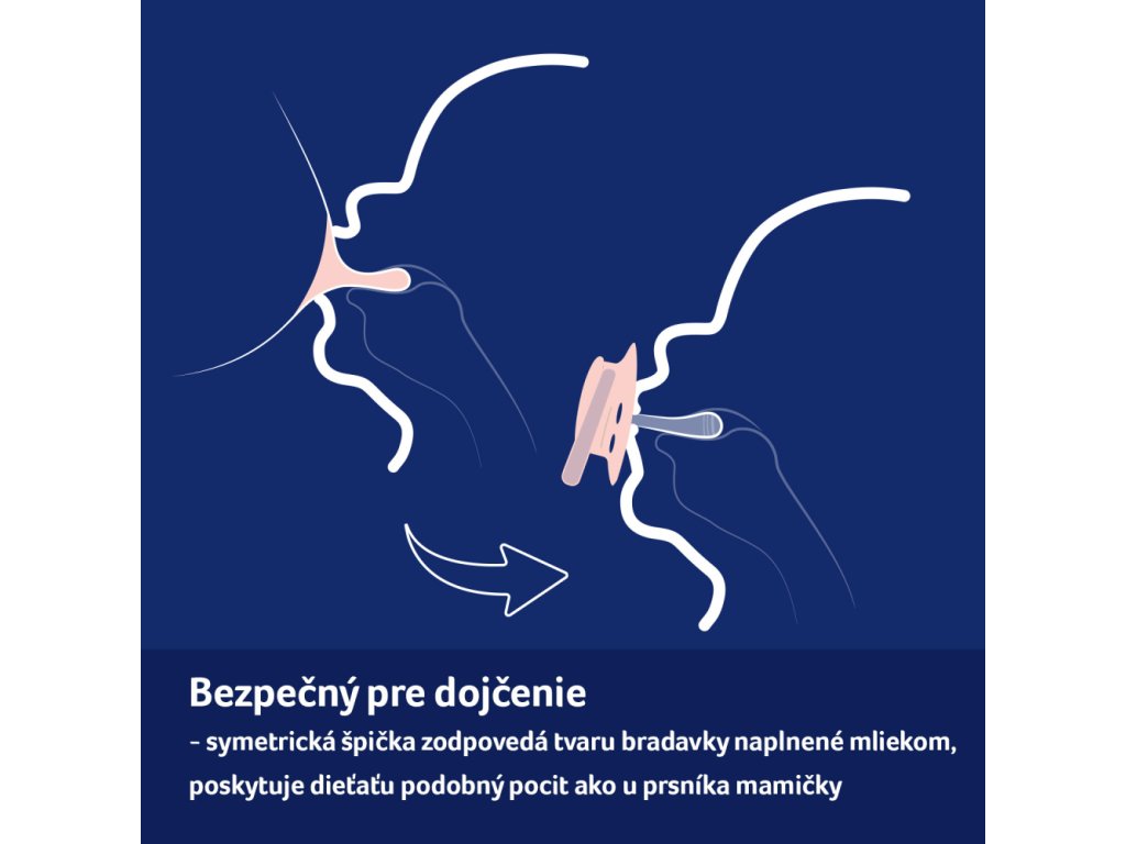 Symetrický tvar špičky vychádza z tvaru bradavky naplnenej mliekom, ktorá poskytuje bábätku známy pocit podobný pocitu z prsníka.
