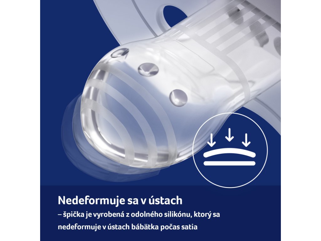 Dynamická špička je vyrobená z nerovnorodých vrstiev silikónu, takže sa predlžuje a zmršťuje v závislosti od rytmu satia dieťaťa.