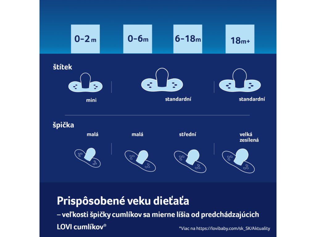Veľkosť sacej časti je prispôsobená veku a fáze vývoja dieťaťa, líši sa od veľkostí sacích častí u štandardných cumlíkov LOVI.