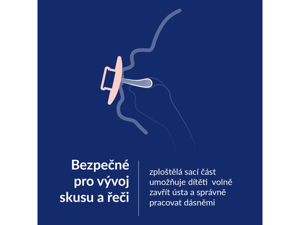 - Dynamický cumlík sa vďaka unikátnej konštrukcii zo silikónu rôznej hrúbky naťahuje a sťahuje podľa rytmu satia dieťaťa. Vďaka tomu chráni jeho sací reflex a nemá nepriaznivý vplyv na dojčenie. Symetrický tvar špičky vychádza z tvaru bradavky naplnenej mliekom, ktorá poskytuje bábätku známy pocit podobný pocitu z prsníka.