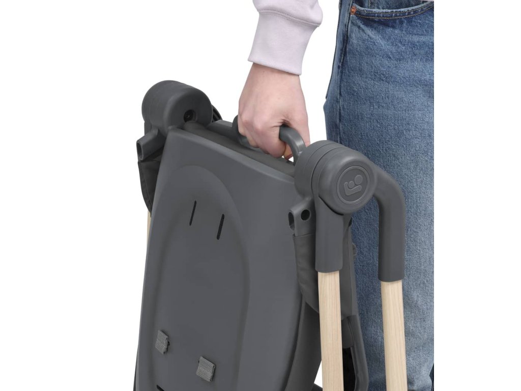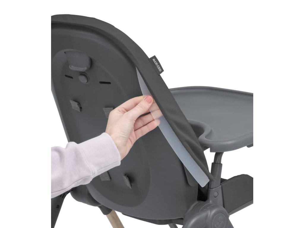 Mäkko polstrovaná sedacia podložka s nastaviteľnými 5-bodovými bezpečnostnými pásmi a opierka nôh poskytujú dieťaťu pohodlné sedenie. Jedálenský pult ponúka tri pozície podľa veľkosti dieťaťa a keď ho nepoužívate, môžete ho zavesiť na zadnú stranu stoličky.
